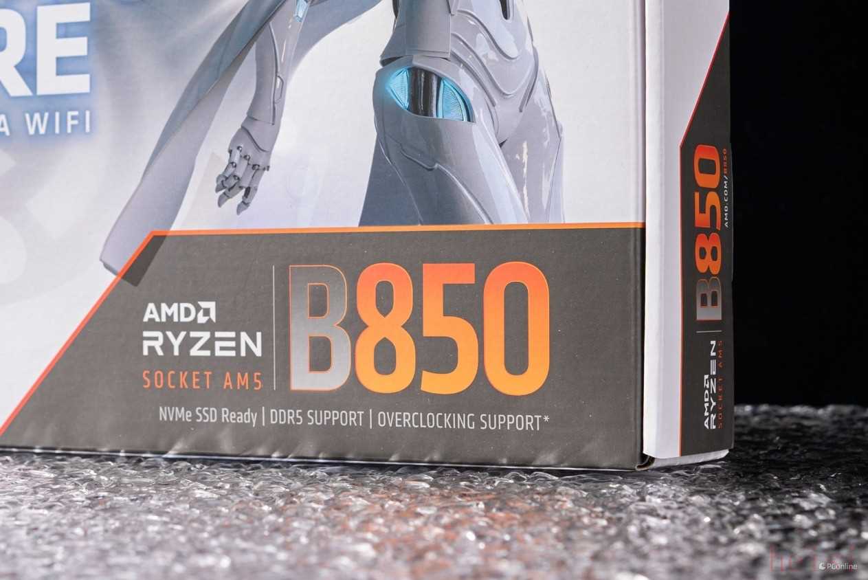 包裝盒的右下角則標注了這款主板的芯片組配置,為AMD B850,并且不同于隔壁家的B系列主板,AMD的B系列主板不僅支持內(nèi)存超頻,還支持CPU超頻。