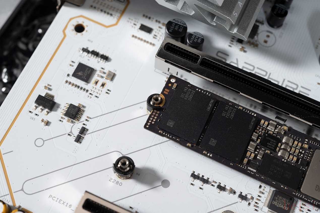 為了方便玩家拆裝硬盤,藍寶石也在每個槽位處安排了M.2固態(tài)硬盤的快拆設(shè)計。不過要是表面的散熱裝甲也能安排快拆設(shè)計那就更好了。