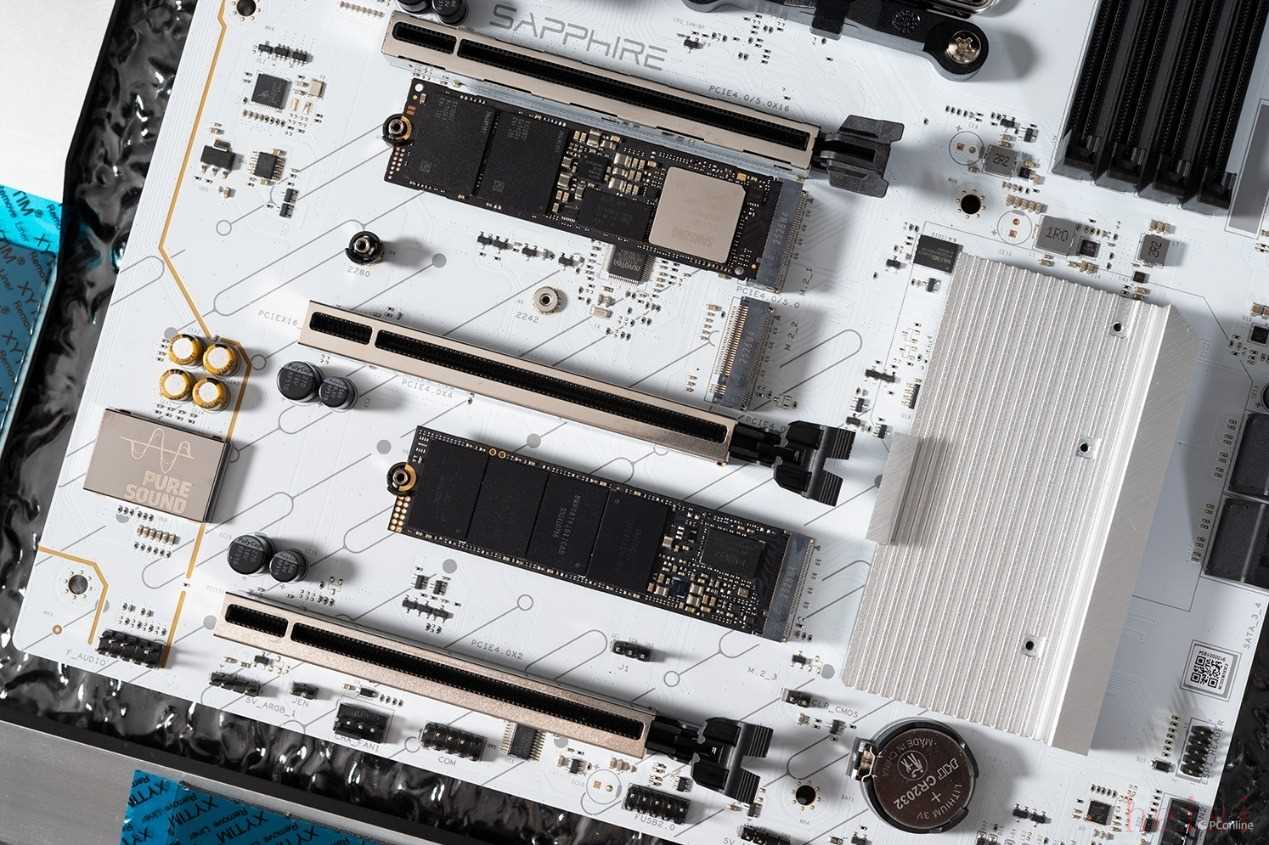 藍寶石PURE極地B850A WIFI主板共有三個M.2固態(tài)硬盤位,其中靠近CPU底座的一組為PCIe 5.0×4標準,剩下的兩組則是PCIe 4.0×4標準。