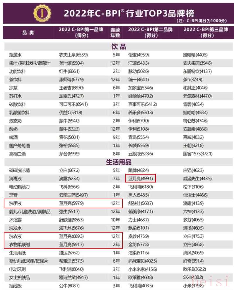 在快消日化領(lǐng)域,藍月亮洗衣液、洗手液表現(xiàn)依舊亮眼,再度蟬聯(lián)洗衣液、洗手液行業(yè)第一品牌,并摘得2021C-BPI“黃金品牌”殊榮,與此同時,在本次公布的榜單中,藍月亮共有4個品類進入同品類排名前三甲。值得關(guān)注的是,自2011年C-BPI指數(shù)發(fā)布以來,藍月亮洗衣液、洗手液品牌力指數(shù)已連續(xù)12年奪得行業(yè)榜首,彰顯了強韌的品牌力,折射出藍月亮的品牌發(fā)展之路行穩(wěn)致遠。