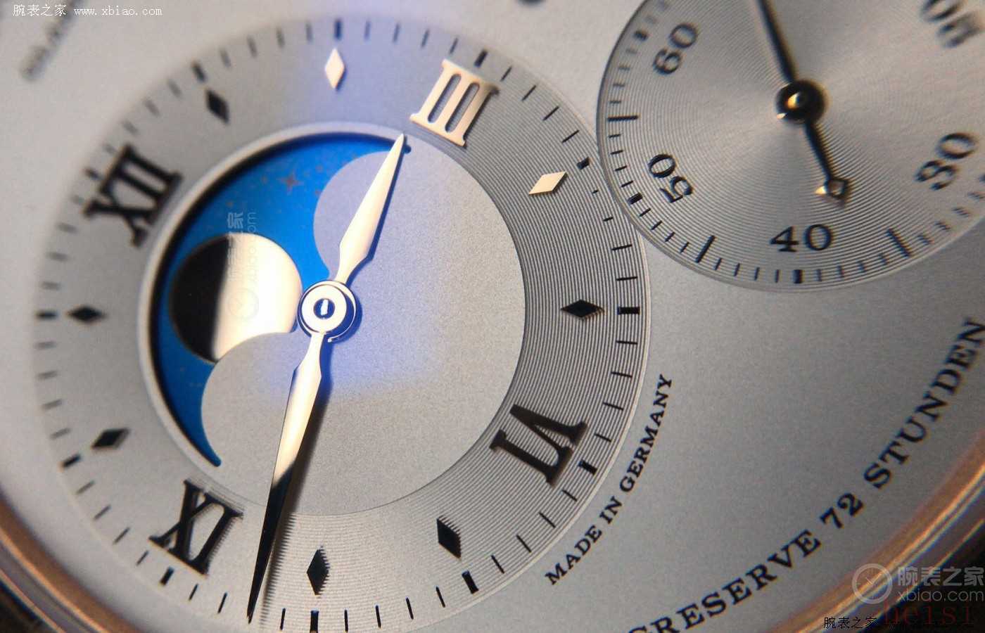 腕表巧妙地將月相顯示與時、分盤相結(jié)合,通過品牌專利涂層技術(shù)展現(xiàn)出絢麗的色彩和清晰的紋理細節(jié)。小小的月相顯示窗口包含300多顆大小不一的星星,呈現(xiàn)一副微型的月夜景象。朗格L095.3型機芯經(jīng)設定后,理論上可使月相顯示準確運行122.6年。
