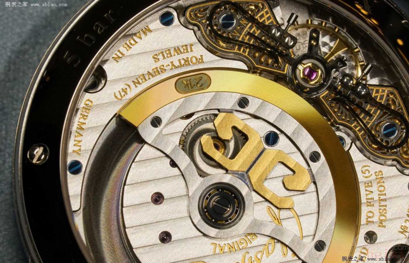 機芯方面,Cal.90-02機芯采用四分之三夾板與雙鵝頸微調(diào),其下方的填金雕刻細節(jié)精美,珍珠擺陀亦加入21K金邊。機芯使用大面積格拉蘇蒂柱狀紋打磨,加上手工鐫刻擺輪夾板以及邊緣倒角等,質(zhì)感細膩。