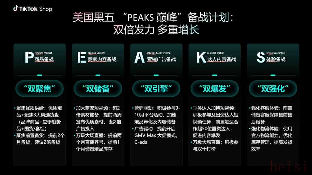 “PEAKS黑五巔峰備戰(zhàn)計(jì)劃”是TikTok Shop官方主導(dǎo)的備戰(zhàn)計(jì)劃,“雙聚焦”、“雙儲備、“雙引擎”、“雙爆發(fā)”、“雙強(qiáng)化”5大主題,聚焦內(nèi)容產(chǎn)出、推廣投流、營銷活動(dòng)、客服體驗(yàn)、優(yōu)質(zhì)供給5大板塊,幫助賣家實(shí)現(xiàn)多重增長。