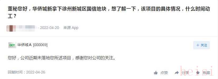 然而,有網(wǎng)友在深交所互動(dòng)易咨詢:華僑城新拿下徐州新城區(qū)國信地塊,想了解一下該項(xiàng)目的具體情況,什么時(shí)間動(dòng)工?
