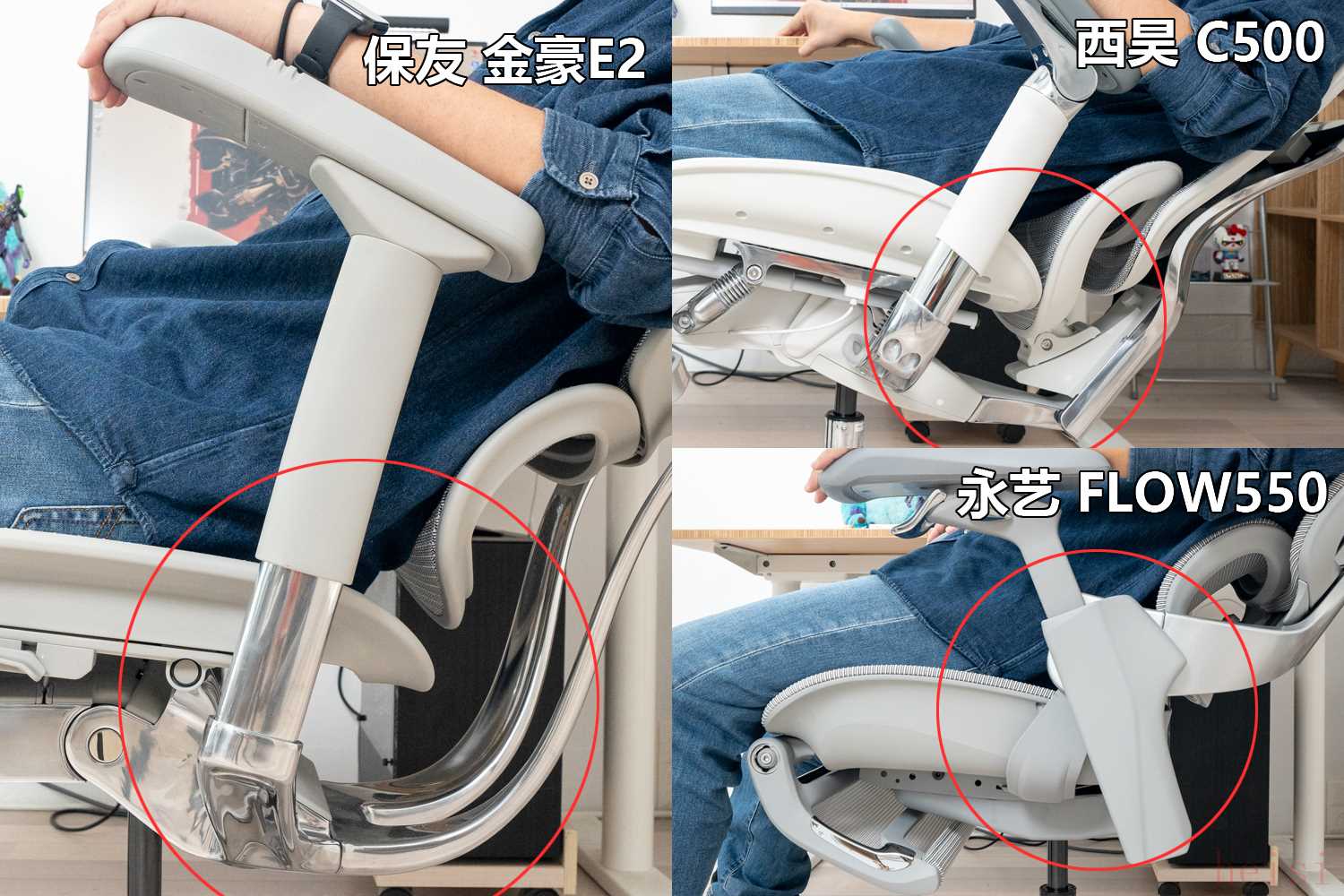 保友 金豪E2和西昊C500的扶手支持與椅背的傾仰聯(lián)動(dòng),永藝FLOW550的扶手并不能跟隨椅背的傾仰同步活動(dòng)。
