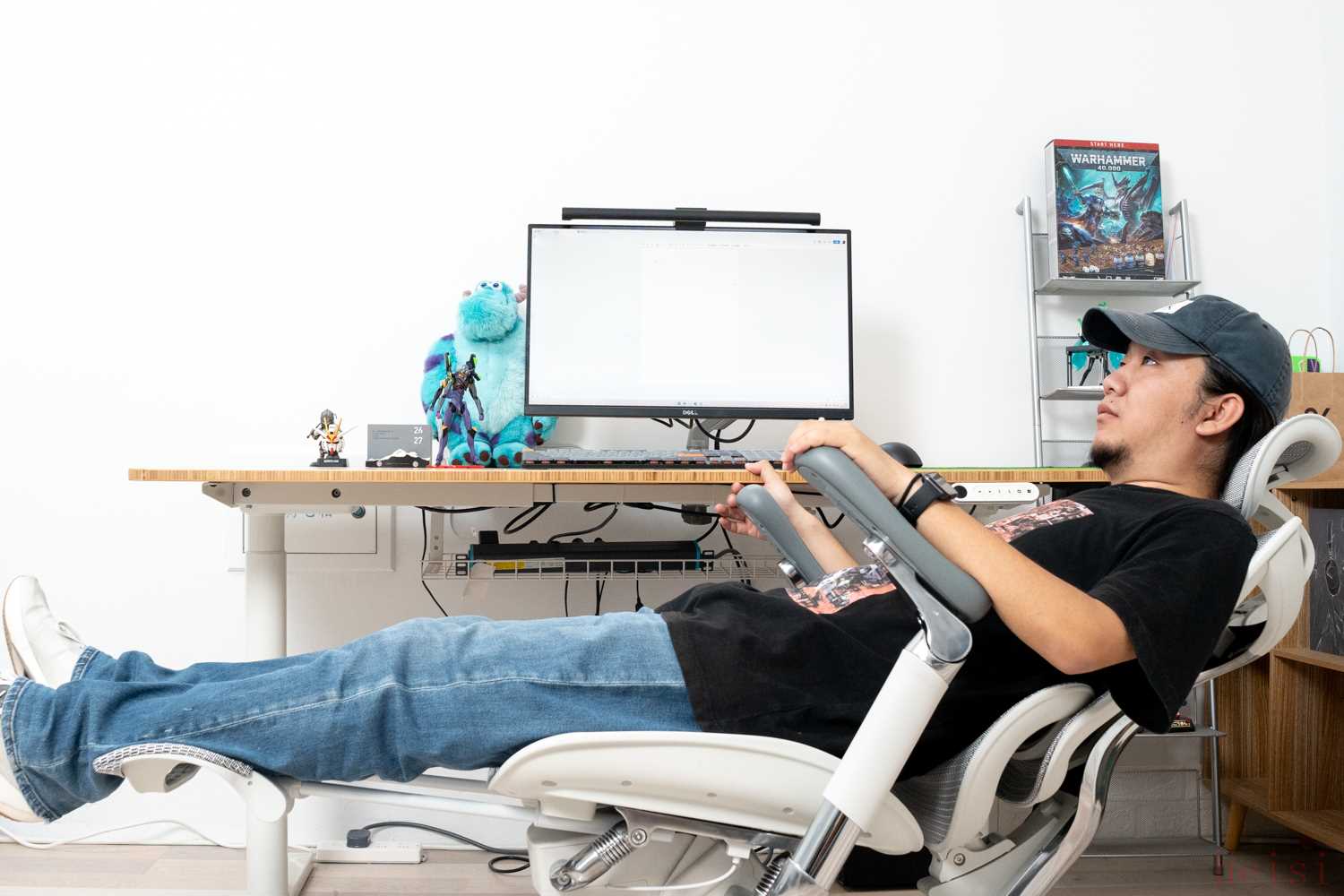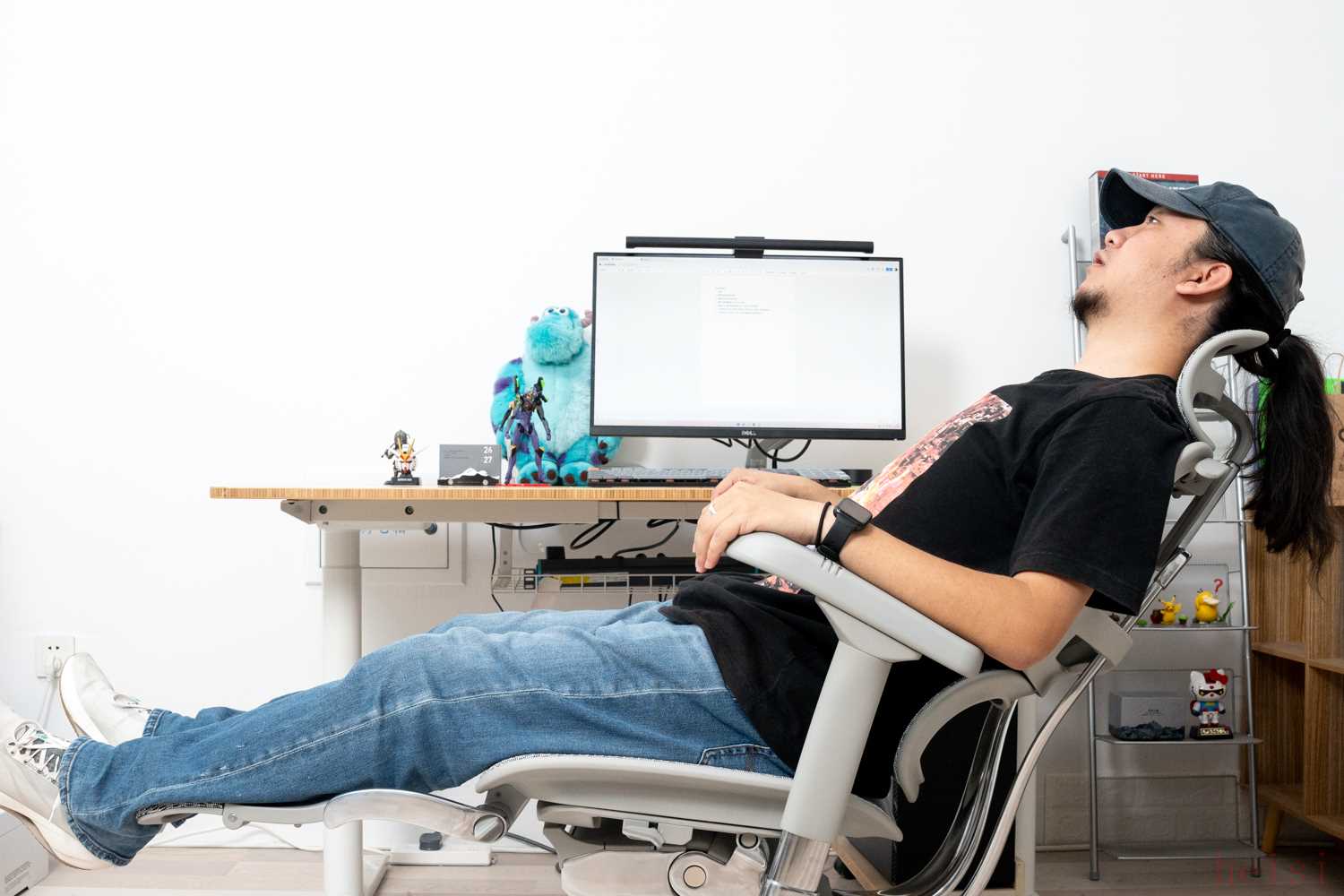 除此之外,還有一個(gè)非常顯著的問(wèn)題就是當(dāng)整把椅子后仰且把腿放在腿托上后,整把椅子會(huì)帶著使用者不受控制的旋轉(zhuǎn),讓我在躺平的過(guò)程中有好幾次因?yàn)閬y轉(zhuǎn)碰到東西,比較影響使用體驗(yàn)。