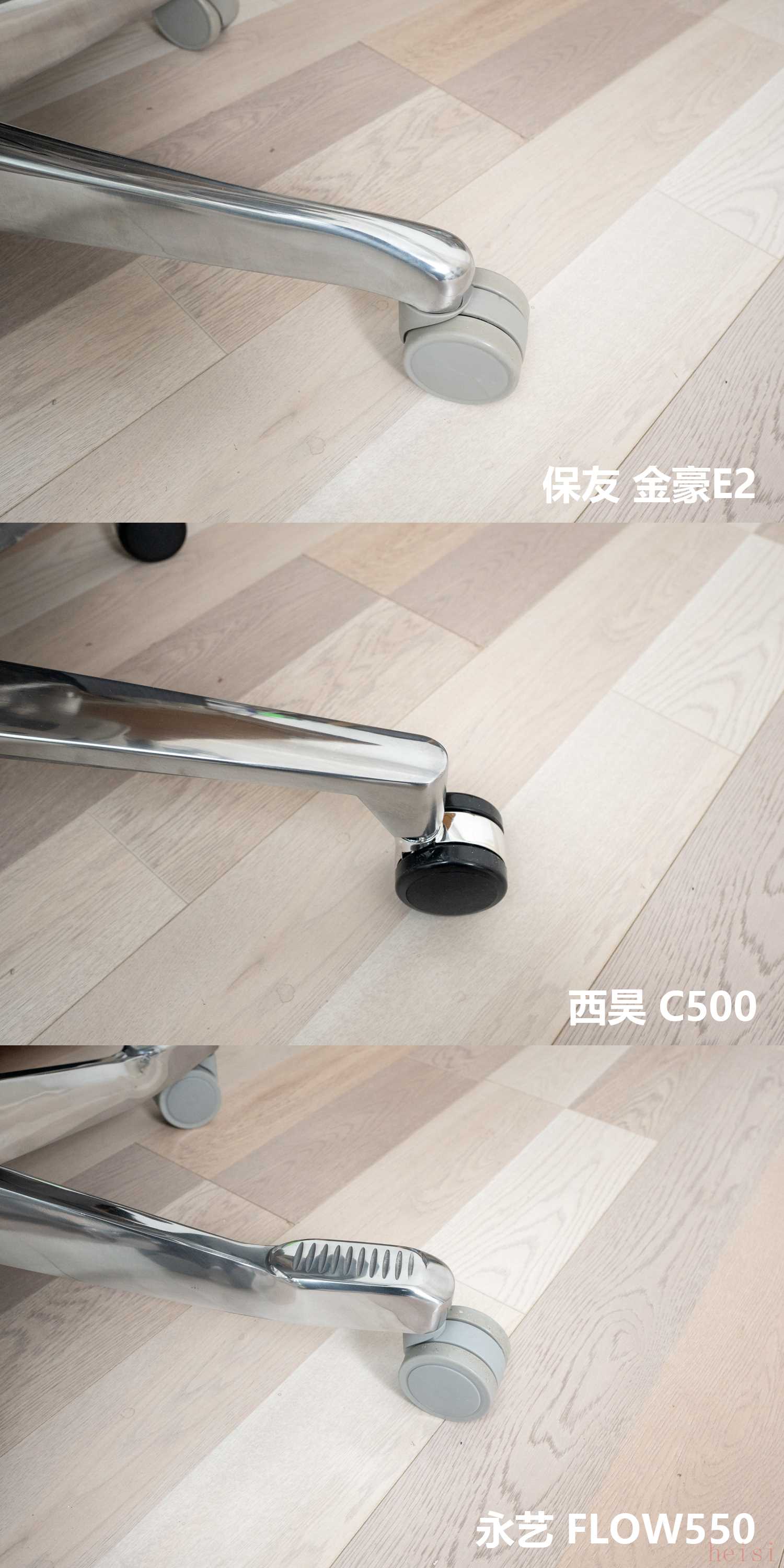 三款人體工學(xué)椅都是全鋁合金五星椅腳+PU靜音輪的配置,承重表現(xiàn)和拖行順暢度表現(xiàn)最好的是保友 金豪E2,永藝FLOW550在移動(dòng)時(shí)會(huì)略顯吃力。