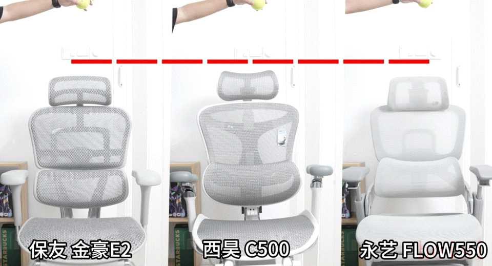 我們用網(wǎng)球分別在三把人體工學(xué)椅的上方進(jìn)行自由落體運(yùn)動(dòng),可以非常明顯地看出,三把人體工學(xué)椅中,保友 金豪E2的回彈明顯要好于其他兩把人體工學(xué)椅,西昊 C500其次,永藝 FLOW550表現(xiàn)最差。