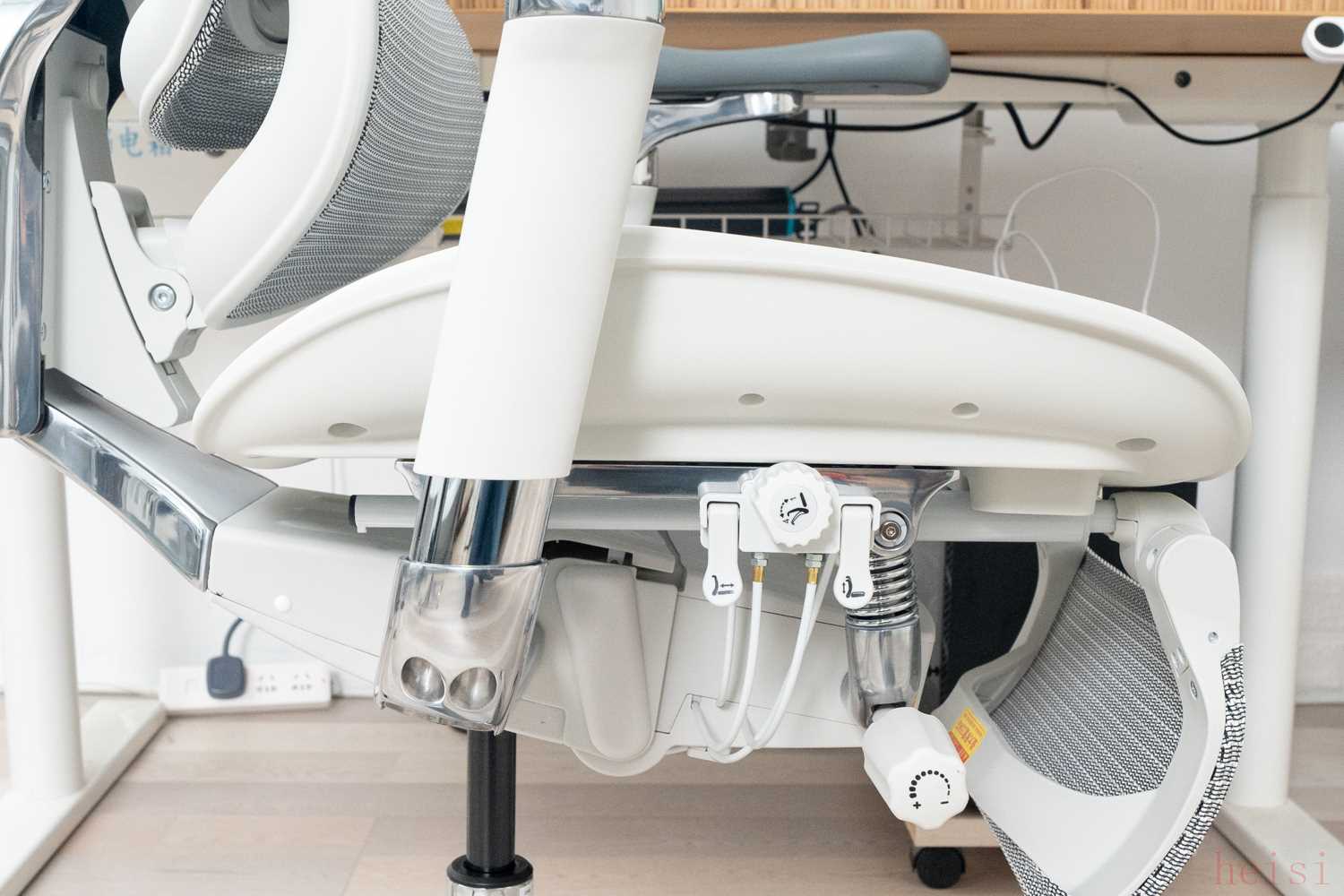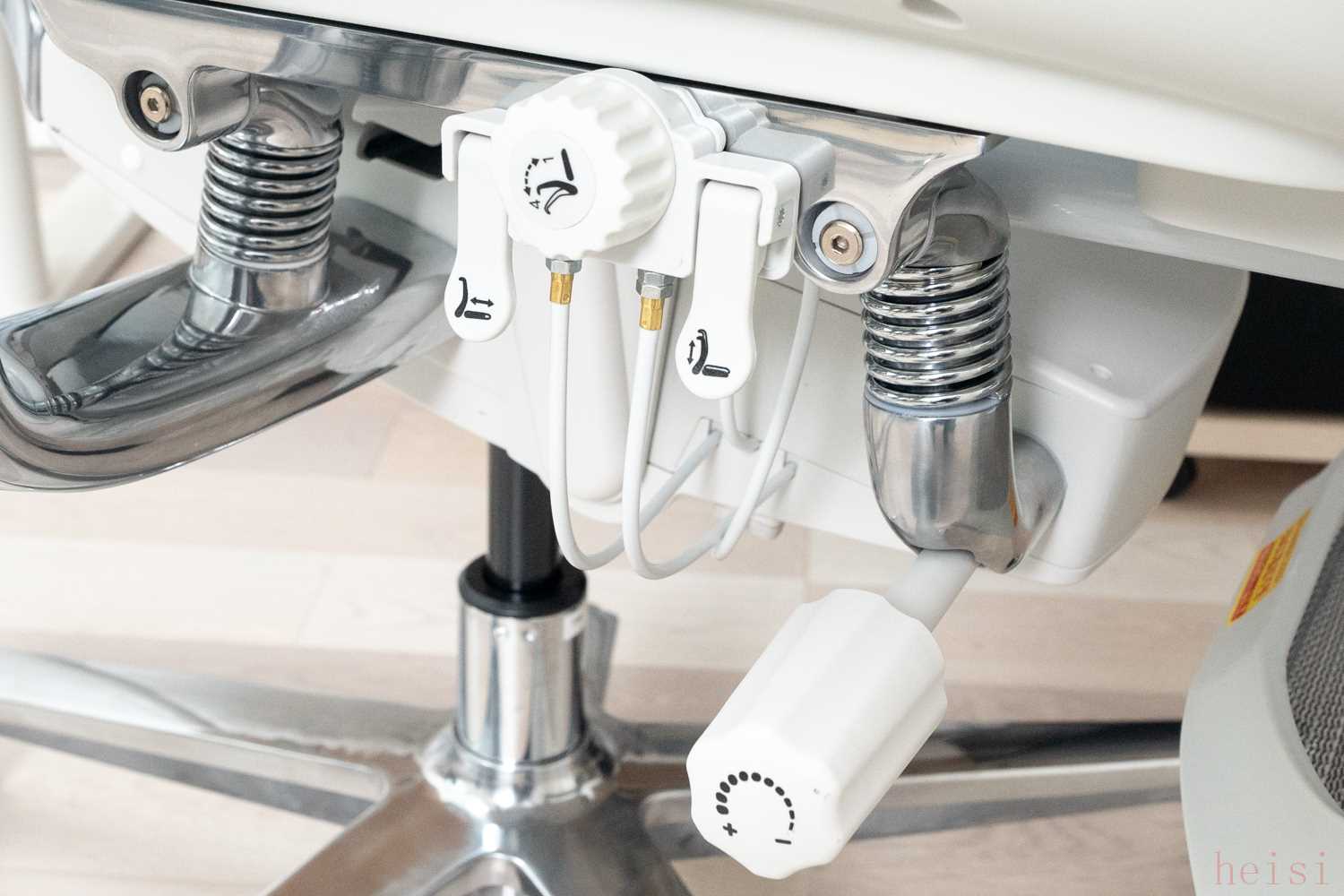 西昊 C500的各種調(diào)節(jié)機(jī)構(gòu)雖然是都集成在同一位置,但是并不是像保友 金豪E2一樣只通過(guò)一根撥桿就能完成全部的調(diào)節(jié),在調(diào)節(jié)的時(shí)候需要撥動(dòng)不同的機(jī)構(gòu),非常的麻煩。而且西昊 C500的底盤(pán)上各種線材也直接裸露在外,加上復(fù)雜的撥桿,給人的視覺(jué)效果就臃腫。
