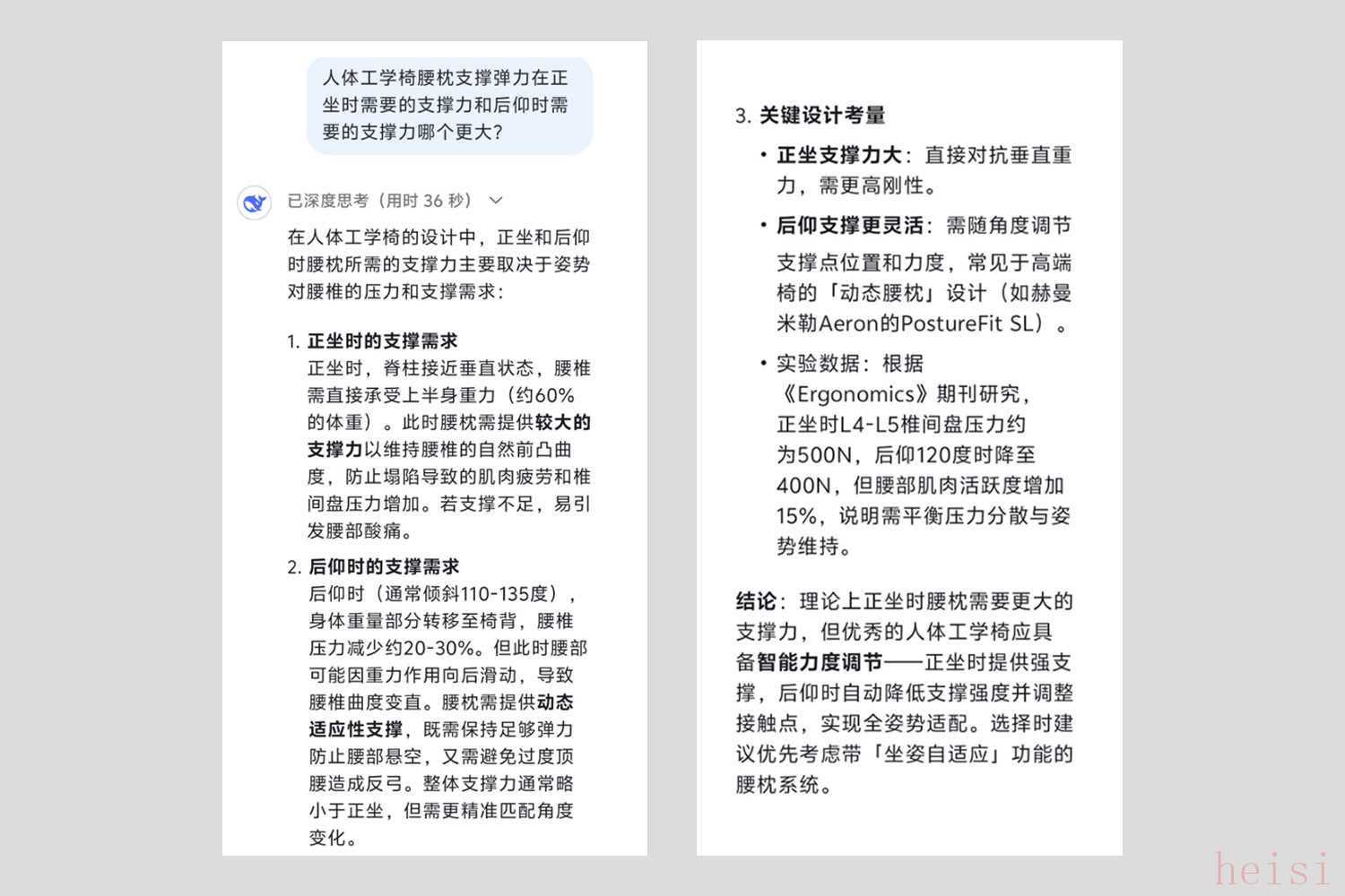 有些人可能覺(jué)得這個(gè)調(diào)節(jié)機(jī)構(gòu)可有可無(wú),我咨詢(xún)了DeepSeek關(guān)于這個(gè)問(wèn)題的見(jiàn)解。我們?cè)谡秃笱鰰r(shí)腰部承受的壓力是不同的,如果腰靠的支撐力度是固定不動(dòng)的,就會(huì)存在支撐力度不能完全適配所有使用情境的情況。優(yōu)秀的人體工學(xué)椅腰靠應(yīng)當(dāng)在正坐時(shí)能夠提供強(qiáng)支撐,后仰時(shí)能夠降低支撐強(qiáng)度并調(diào)整接觸點(diǎn),實(shí)現(xiàn)全姿勢(shì)適配。
