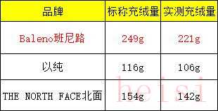 10款產(chǎn)品中,標(biāo)稱品牌為Baleno、THE NORTH FACE、以純的3款樣品,充絨量實(shí)測(cè)值與標(biāo)稱值不符。其中由廣州友誼班尼路服飾有限公司生產(chǎn)的Baleno班尼路一款180/104A型羽絨外套充絨量實(shí)測(cè)值達(dá)到221g,在10款樣品中位居第一,但是仍然比標(biāo)稱值少了21g,實(shí)測(cè)值與標(biāo)示值的差值最大。對(duì)此,班尼路一工作人員表示,現(xiàn)在正在跟進(jìn)階段,“現(xiàn)階段無可奉告”。