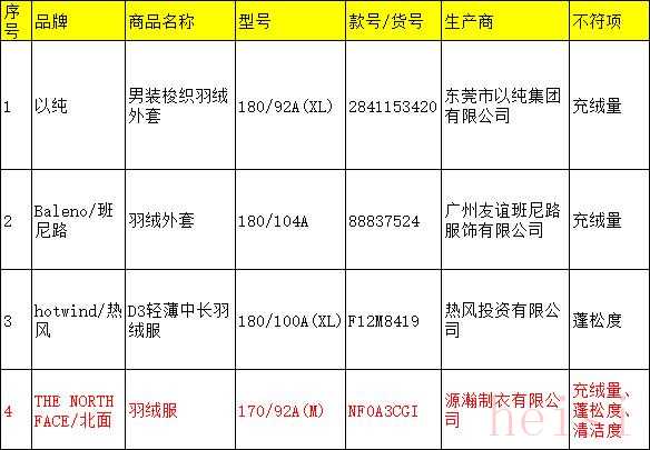 另一款不達(dá)標(biāo)產(chǎn)品由源瀚制衣有限公司生產(chǎn),是一款THE NORTH FACE/北面的170/92A(M)型羽絨服,該款樣品蓬松度檢出值13.8cm,也少于標(biāo)準(zhǔn)限值15cm。
