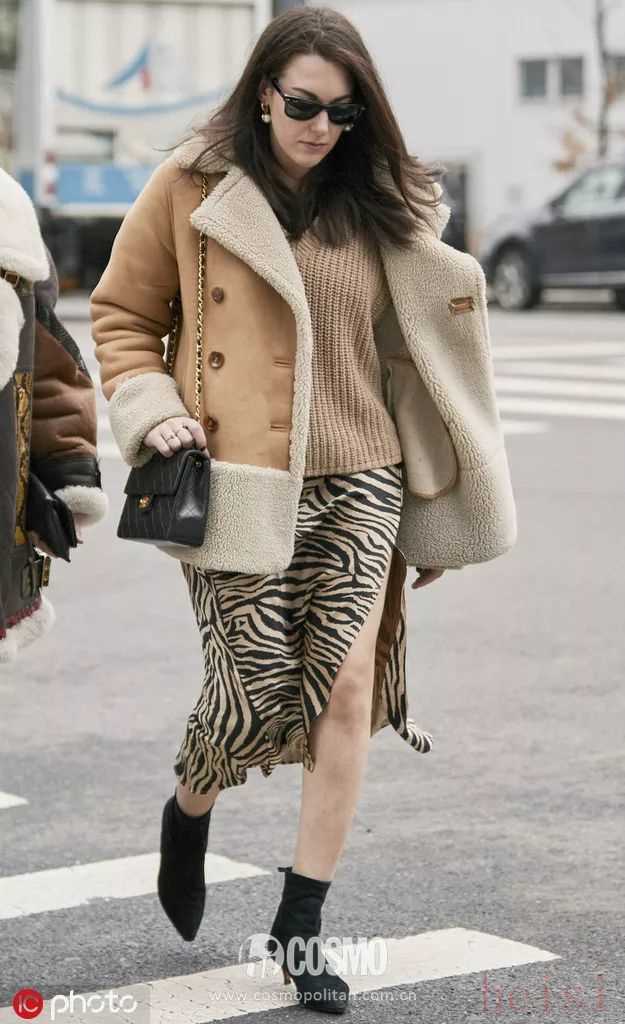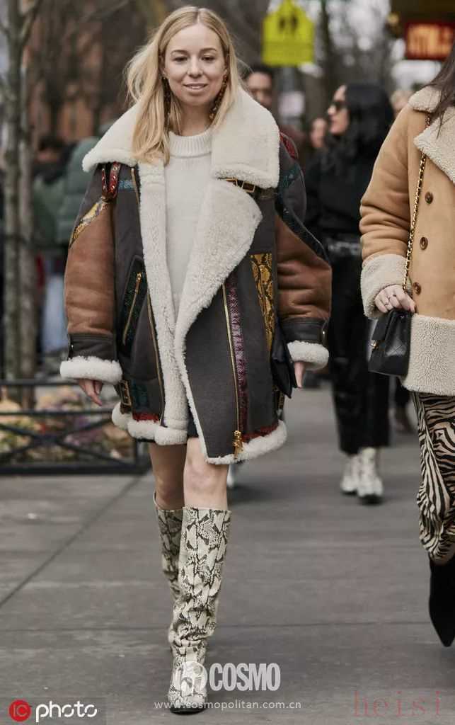覺(jué)得純色太單調(diào)的也可以選擇,皮質(zhì)外套上花點(diǎn)心思。一般會(huì)在袖子上拼接不同材質(zhì)的圖案。中長(zhǎng)款的拼接皮毛一體外套,衣服上的動(dòng)物紋和鞋子相呼應(yīng),玩起下衣失蹤的造型來(lái)也十分新穎時(shí)尚。
