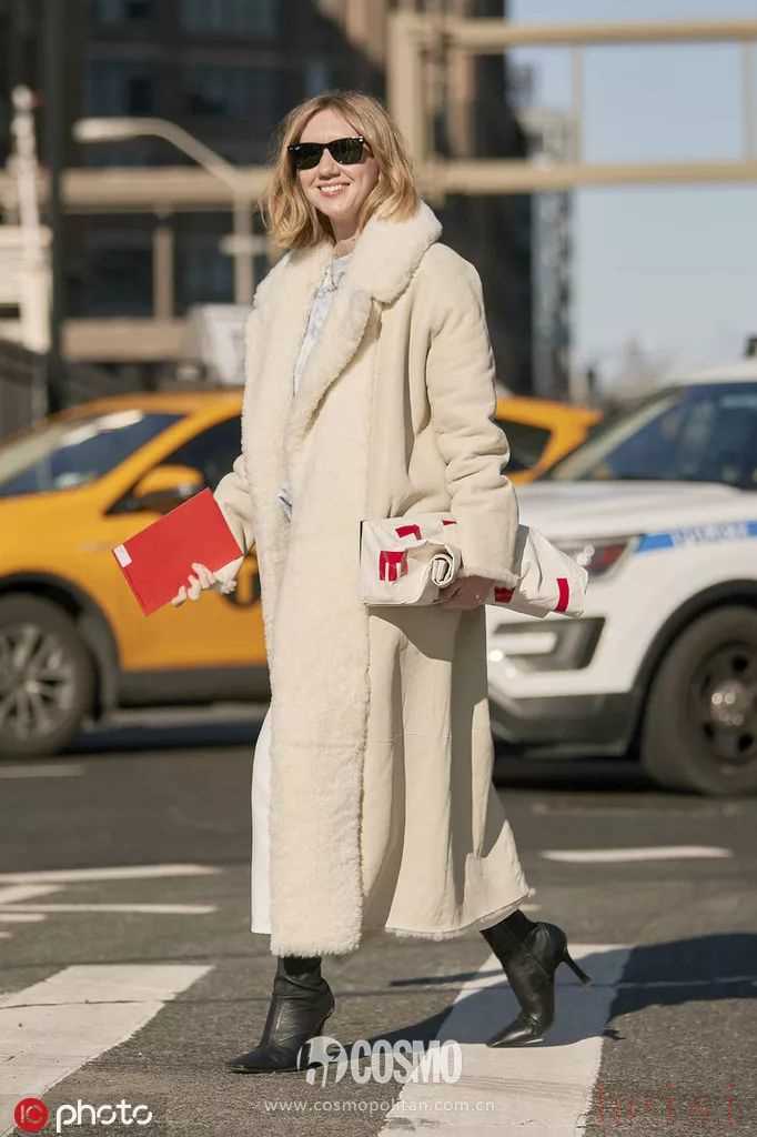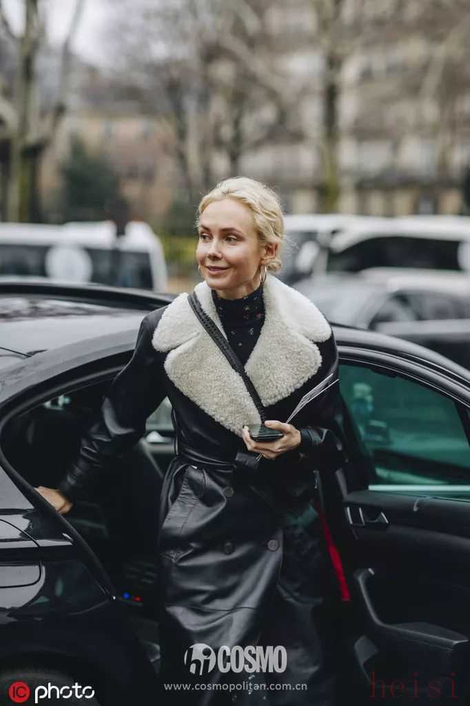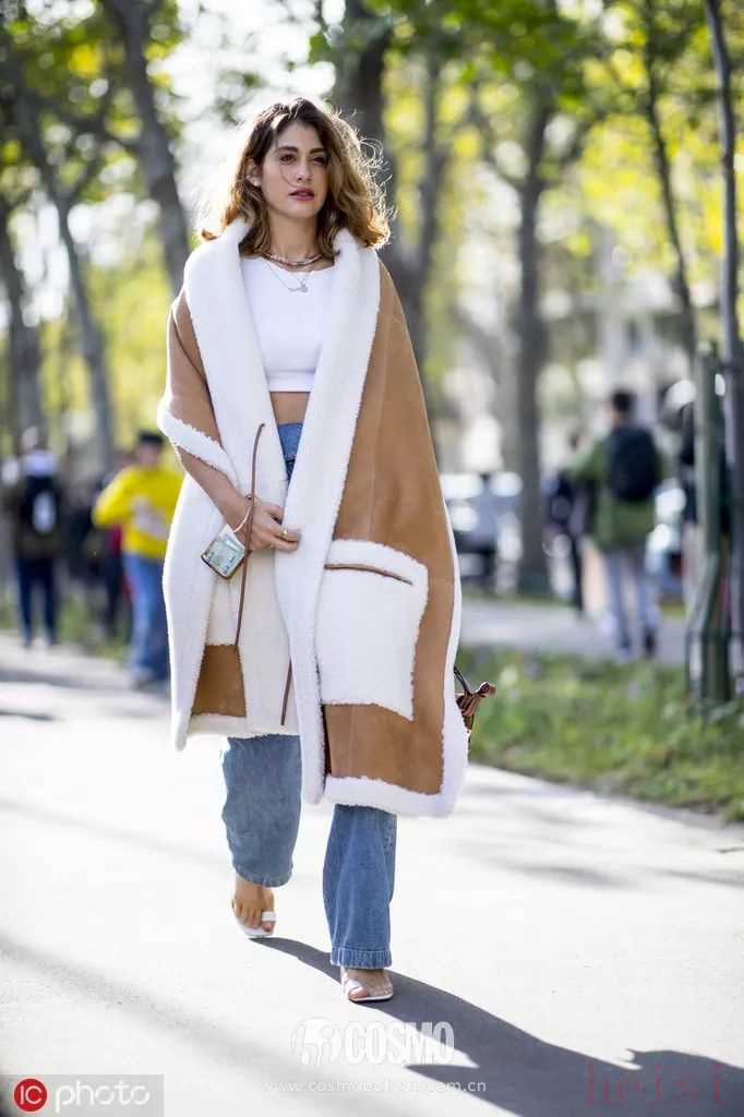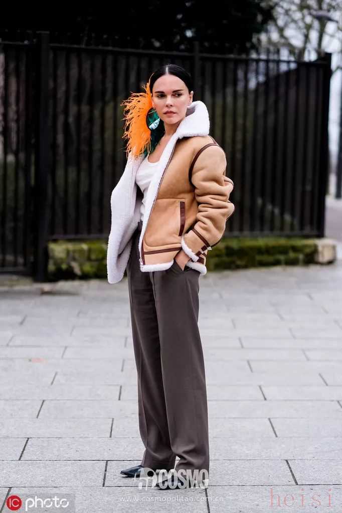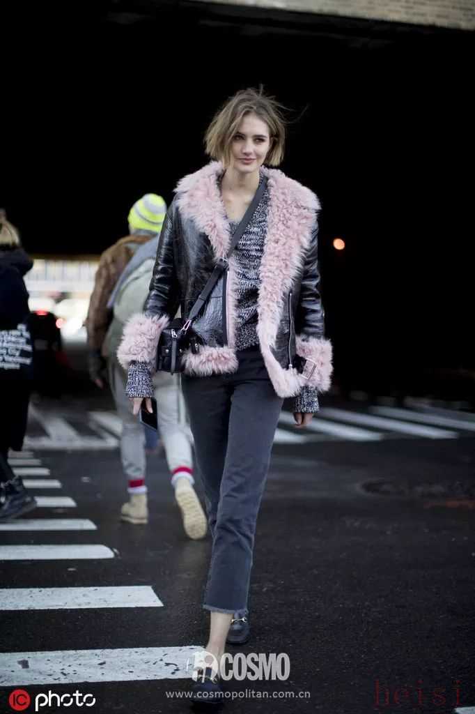 向來(lái)都愛(ài)超短款的超模們?cè)谶x擇皮毛一體外套時(shí)也不忘選擇及腰的款式,淺色深色的都嘗試過(guò),下搭直筒工裝褲摩登又利落。