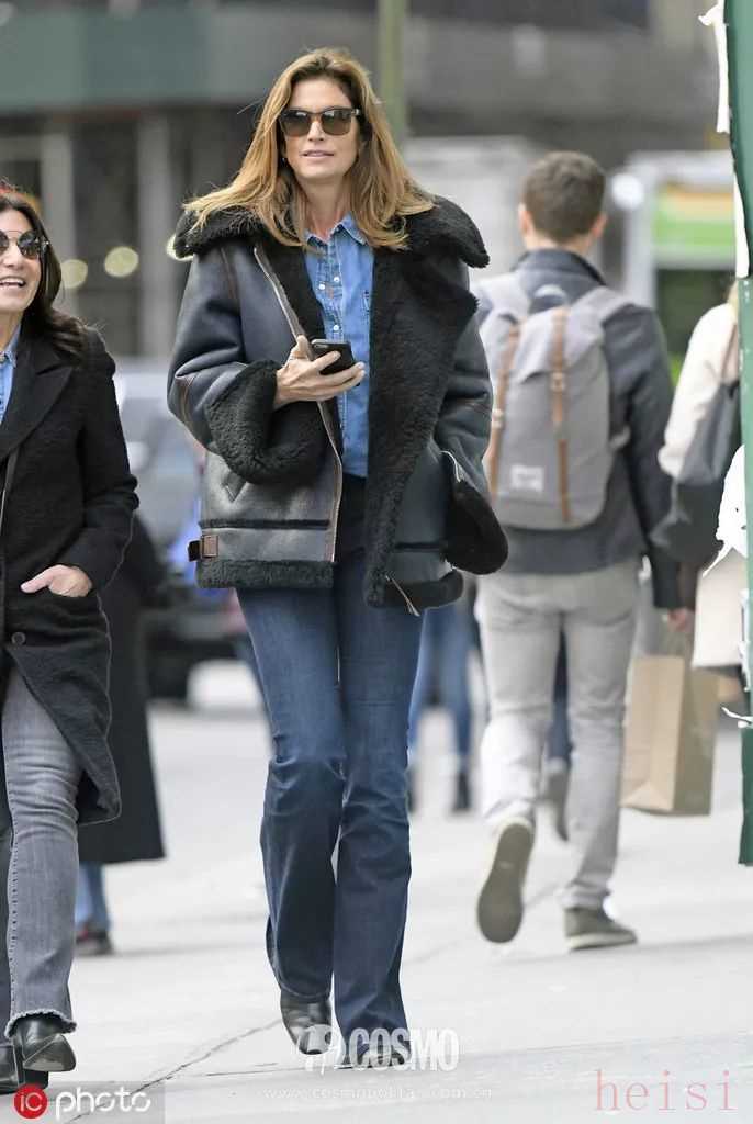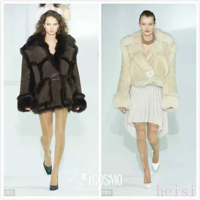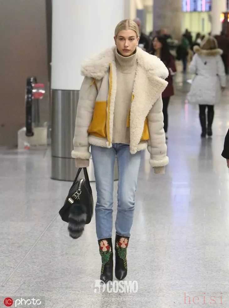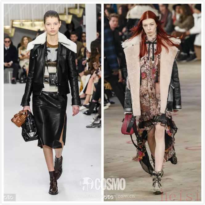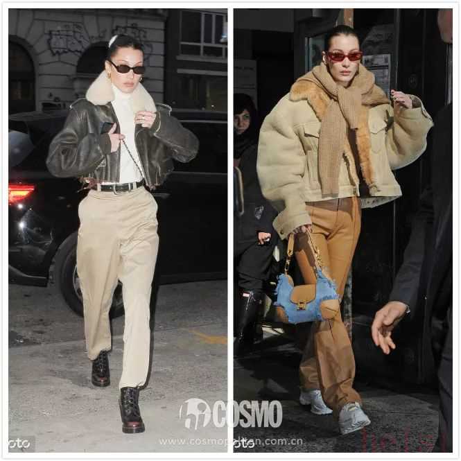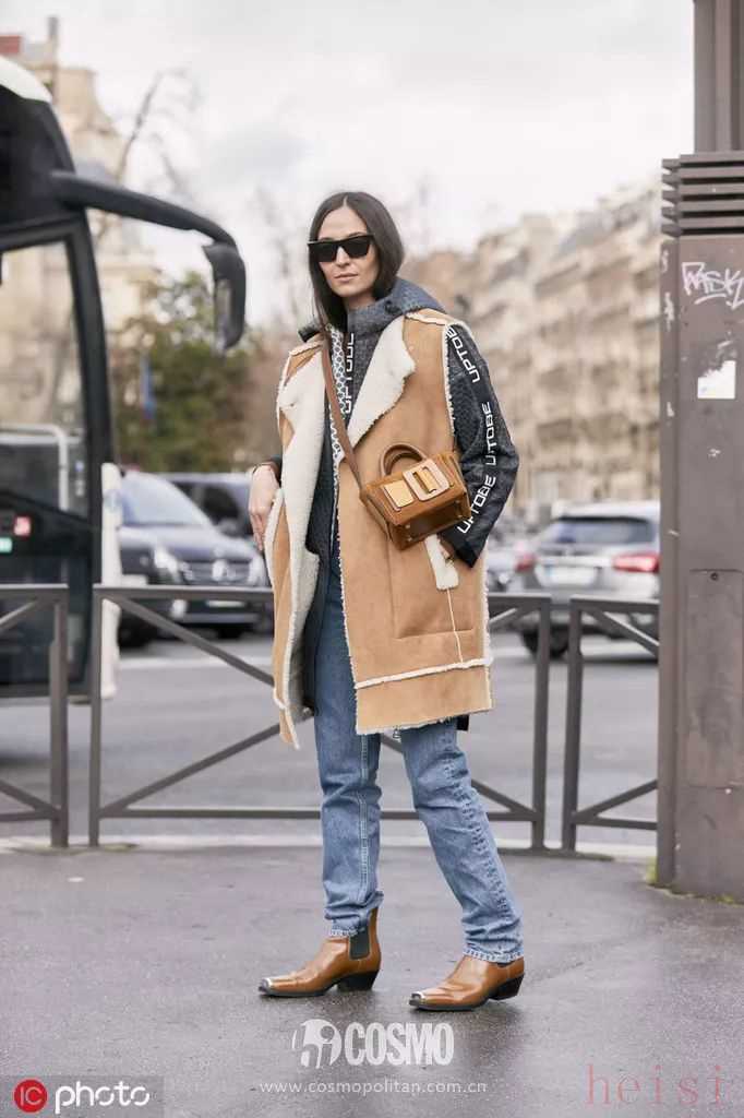 向來(lái)都愛(ài)超短款的超模們?cè)谶x擇皮毛一體外套時(shí)也不忘選擇及腰的款式,淺色深色的都嘗試過(guò),下搭直筒工裝褲摩登又利落。