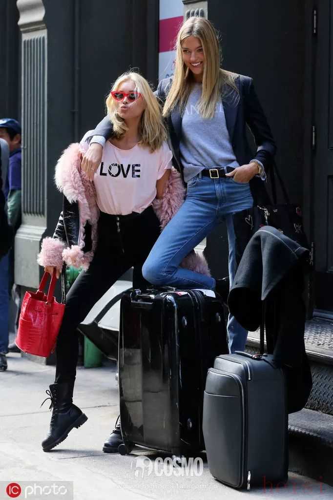 Elsa Hosk也pick過(guò)這一件,黑色漆皮淡粉色的。粉色的毛毛超有少女感,搭配一條黑色高腰褲,又甜又颯。