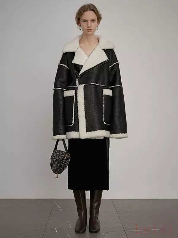 長(zhǎng)款外套和羊羔毛的結(jié)合也意外地和諧,all black的造型,有了白色羊羔毛的點(diǎn)綴散發(fā)出迷人的魅力。