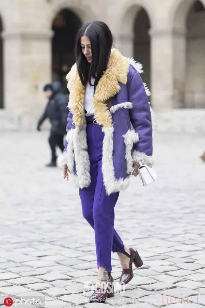 大面積亮色外套的搭配確實(shí)特別,但是日常穿搭難度指數(shù)比較高,不如小面積點(diǎn)綴來(lái)的靠譜。“大嫂”Rosie Huntington Whiteley 穿的這件就很好看,黑色亮漆皮搭配薰衣草紫色的皮毛一體外套,時(shí)髦又很A。