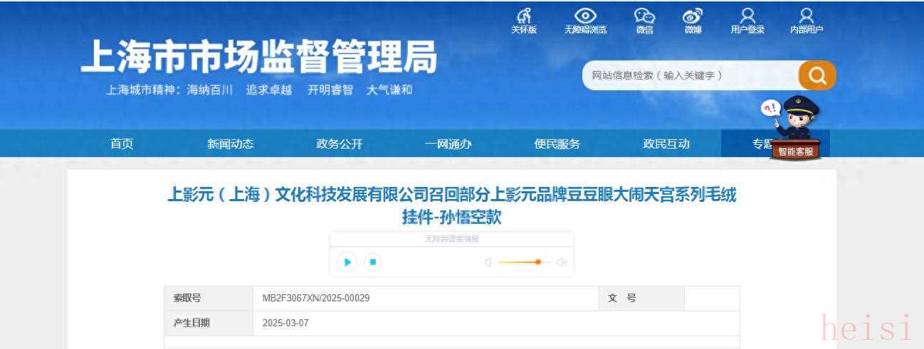 中國質(zhì)量新聞網(wǎng)訊 據(jù)上海市市場監(jiān)管局3月7日消息,上影元(上海)文化科技發(fā)展有限公司召回部分上影元品牌豆豆眼大鬧天宮系列毛絨掛件-孫款。