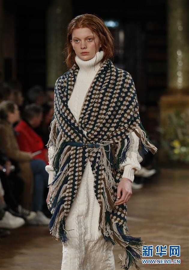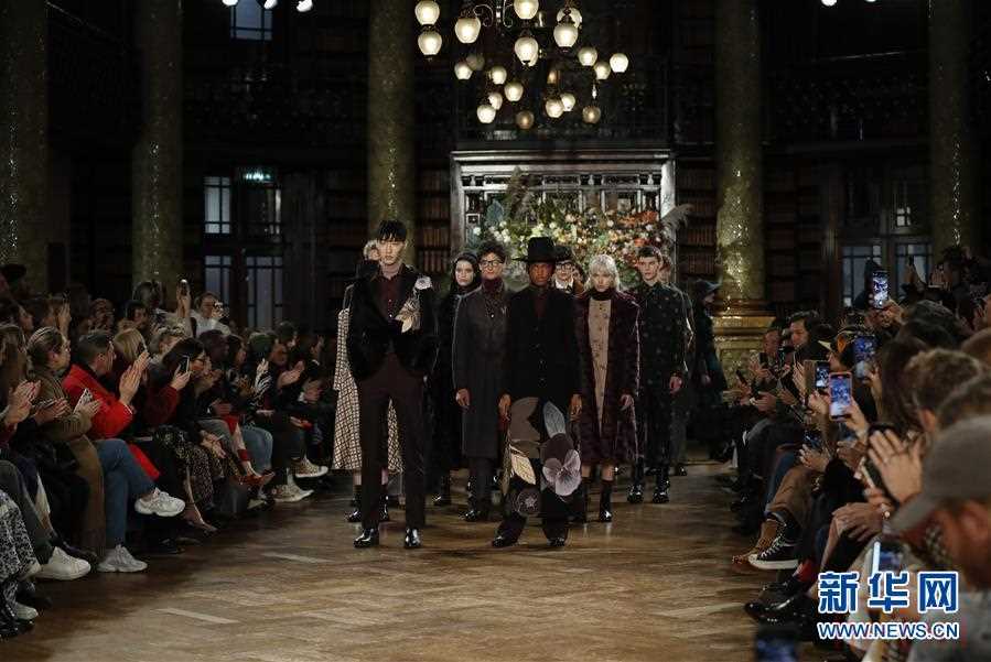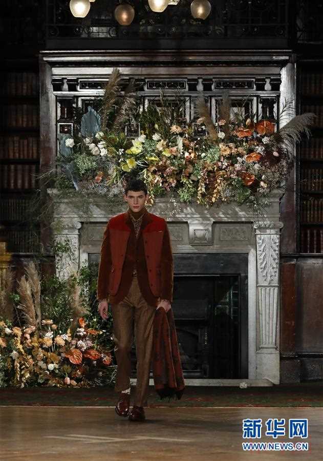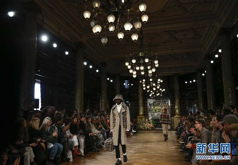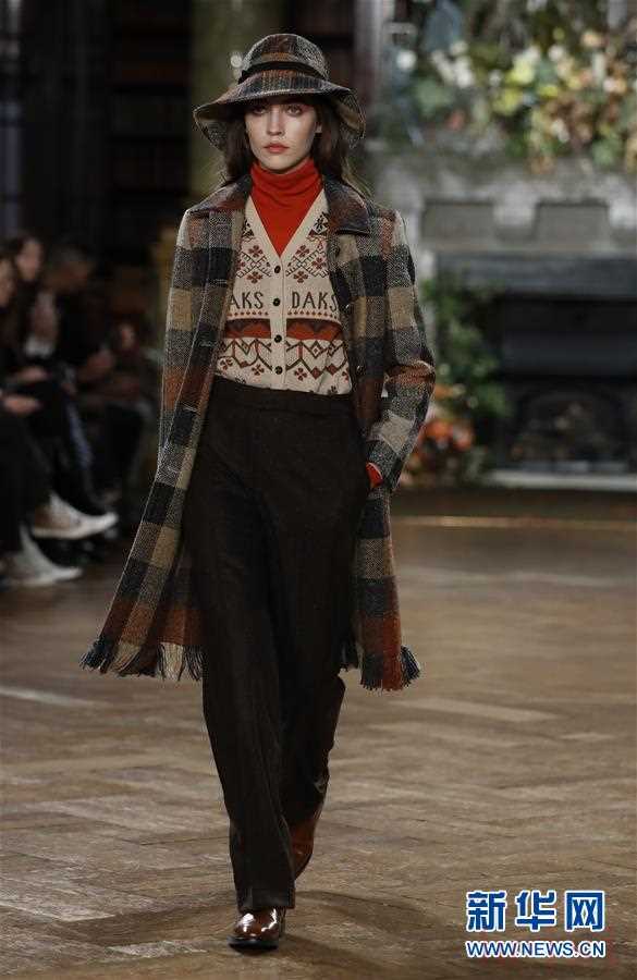 2月18日,在英國倫敦一家圖書館,模特在2020倫敦秋冬時裝周上展示DAKS品牌服飾。 當日,2020倫敦秋冬時裝周落幕。 新華社記者 韓巖 攝
