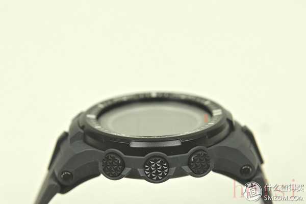 側(cè)面的三個按鍵為金屬鋁材質(zhì),菱形的帶棱角打磨按鈕對手表美感和操作防滑都有加分!不過這種設(shè)計(jì)容易掉漆。