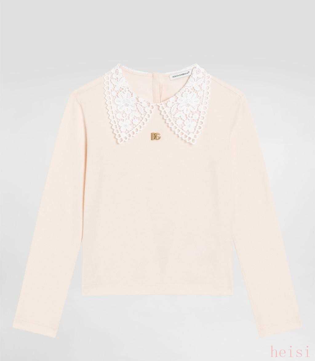 先說(shuō)那件Macramé蕾絲衣領(lǐng)的平紋針織T恤, 面料摸上去柔到讓人想起小時(shí)候的絨被, 親膚是真的關(guān)鍵, 因?yàn)楹⒆泳褪遣煌?dòng),衣服和皮膚的摩擦如果能降到最低,整個(gè)人的情緒就穩(wěn)了. 領(lǐng)口的手工蕾絲不是為了“裝嫩”, 它在視覺(jué)上拉長(zhǎng)了頸項(xiàng),在觸感上又做了包邊處理,不刮皮膚. 后中水滴開(kāi)襟這個(gè)設(shè)計(jì),小孩自己也能學(xué)著扣, 對(duì)培養(yǎng)獨(dú)立性比拼名牌要有用得多. DG的小金屬標(biāo)牌,在我看來(lái)像一句低調(diào)的簽名,不會(huì)搶走服裝本身的溫柔.