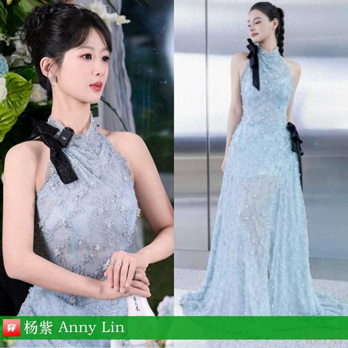 楊紫,品牌直播活動。藍(lán)色蕾絲掛脖禮服:Anny Lin。今年每次亮相都能讓人眼前一亮,妝造很不錯哦。