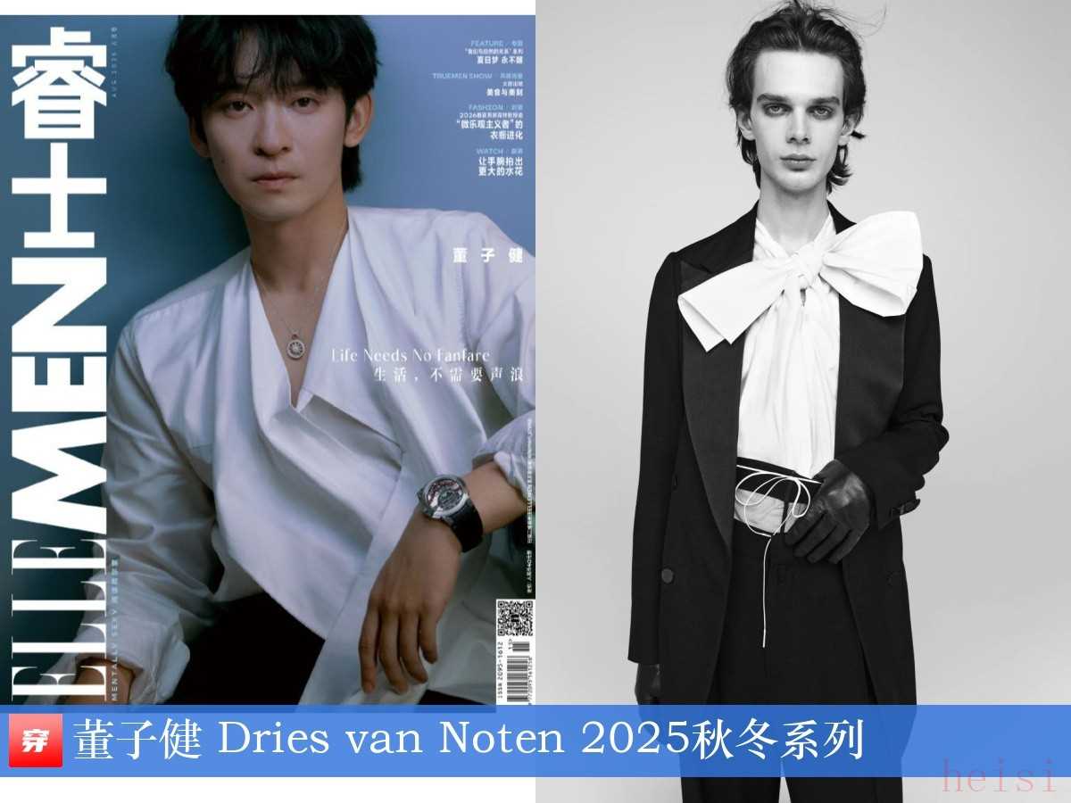 董子健,《睿士ELLE MEN》2025年8月刊。白色大蝴蝶結(jié)襯衣、黑色雙排扣西裝:Dries van Noten 2025秋冬系列。