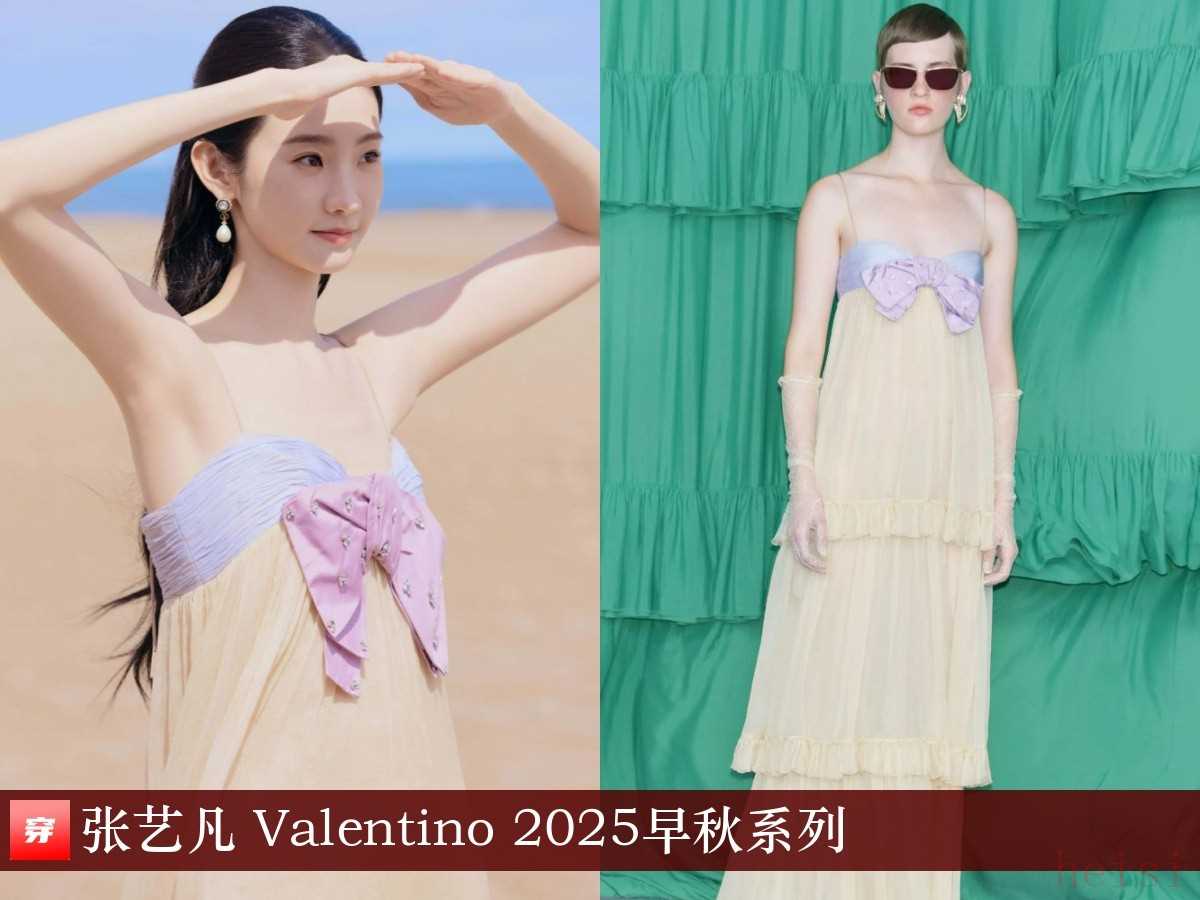 張藝凡,工作室曬圖。蝴蝶結(jié)裝飾淺黃色層疊吊帶裙:Valentino 2025早秋系列。效果真不好說,^_^