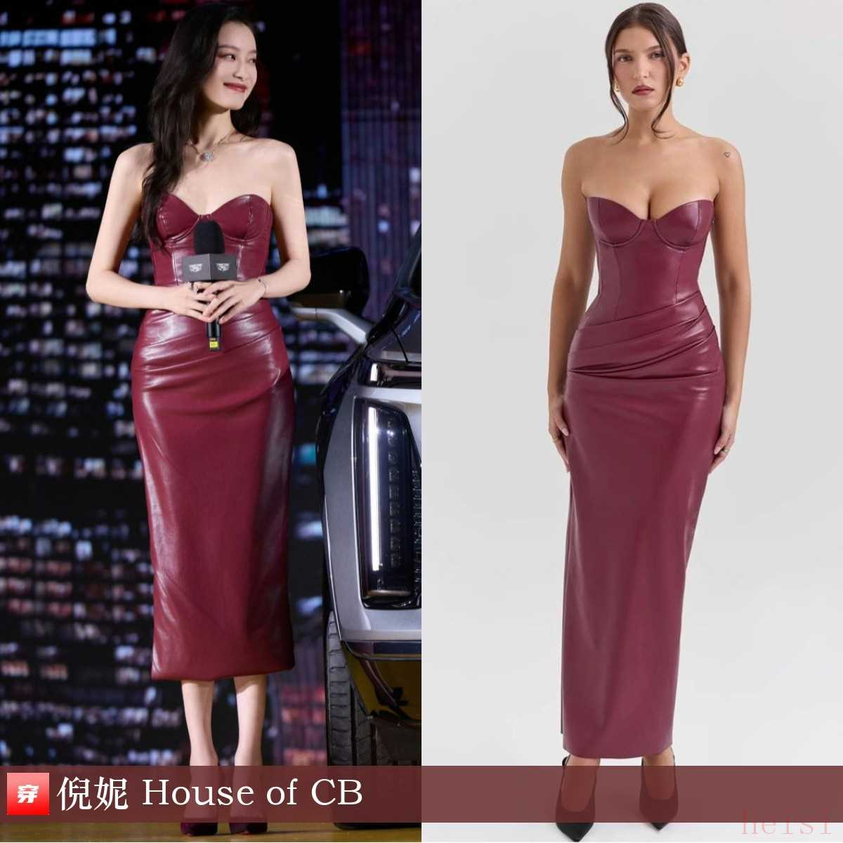 倪妮,品牌發(fā)布會。酒紅色皮革抹胸裙:House of CB。好身材,顯出來!
