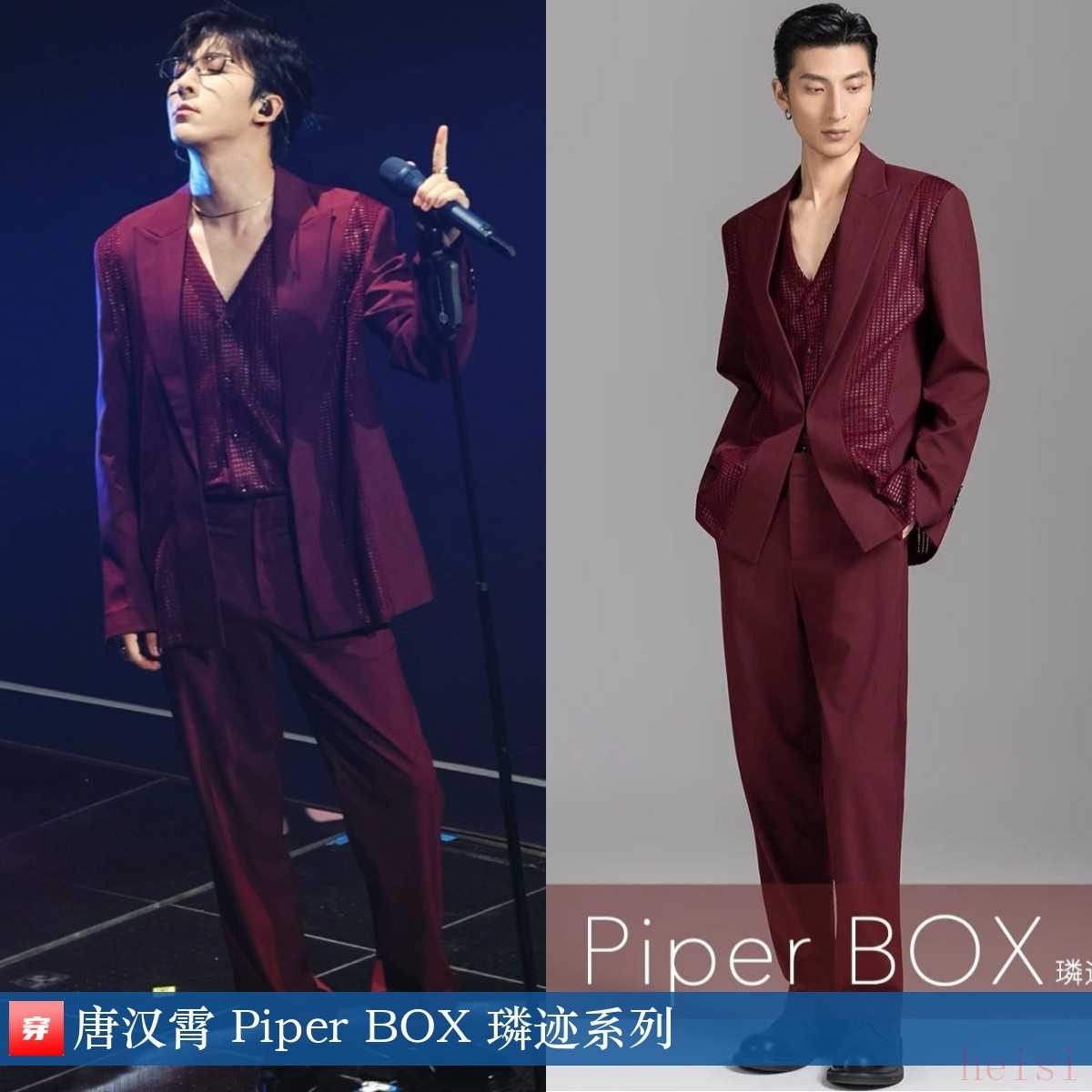 唐漢霄,第32屆東方風(fēng)云榜音樂盛典。酒紅色拼接西服套裝:Piper BOX 璘跡系列。