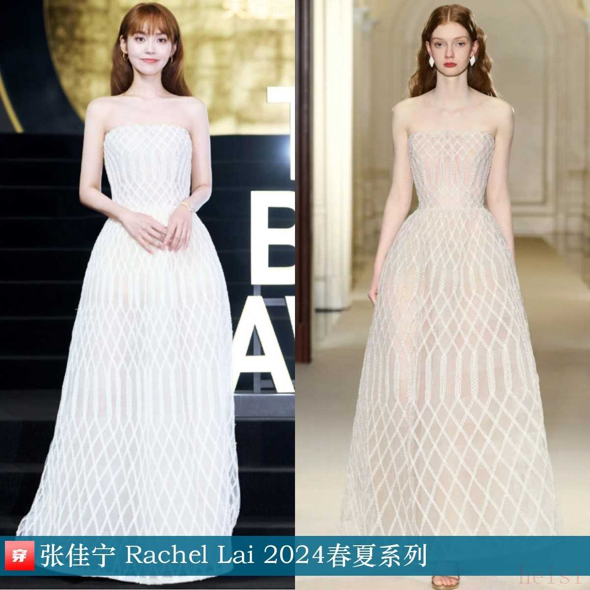 張佳寧,2025天貓金妝獎頒獎盛典。米色菱格紋盤花編織抹胸連衣裙:Rachel Lai 2024春夏系列。很美的裙子,人也很漂亮。