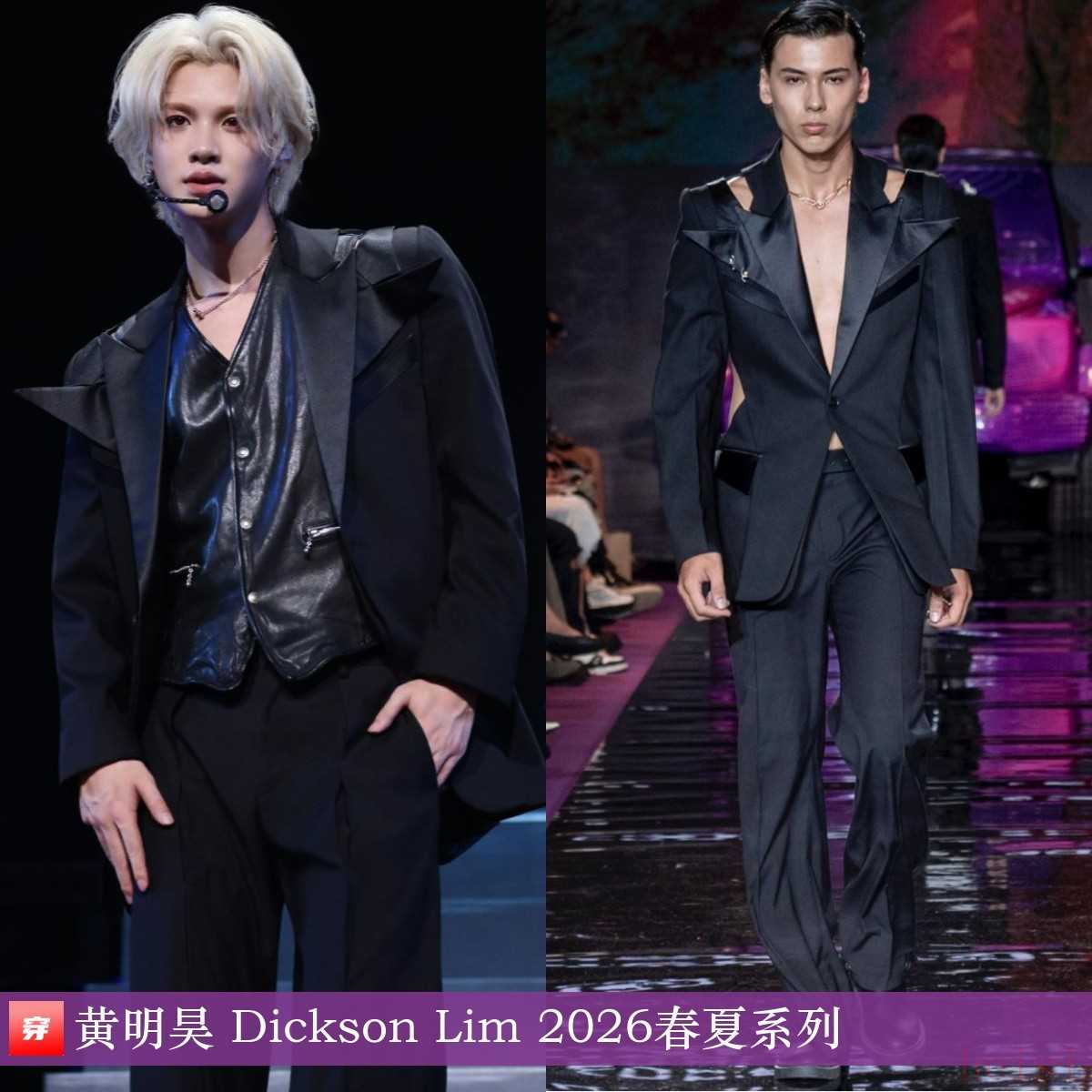 黃明昊,「賈想世界」個人演唱會成都站。黑色拼皮鏤空廓形西裝:Dickson Lim 2026春夏系列??峥岬娜贚OOK。