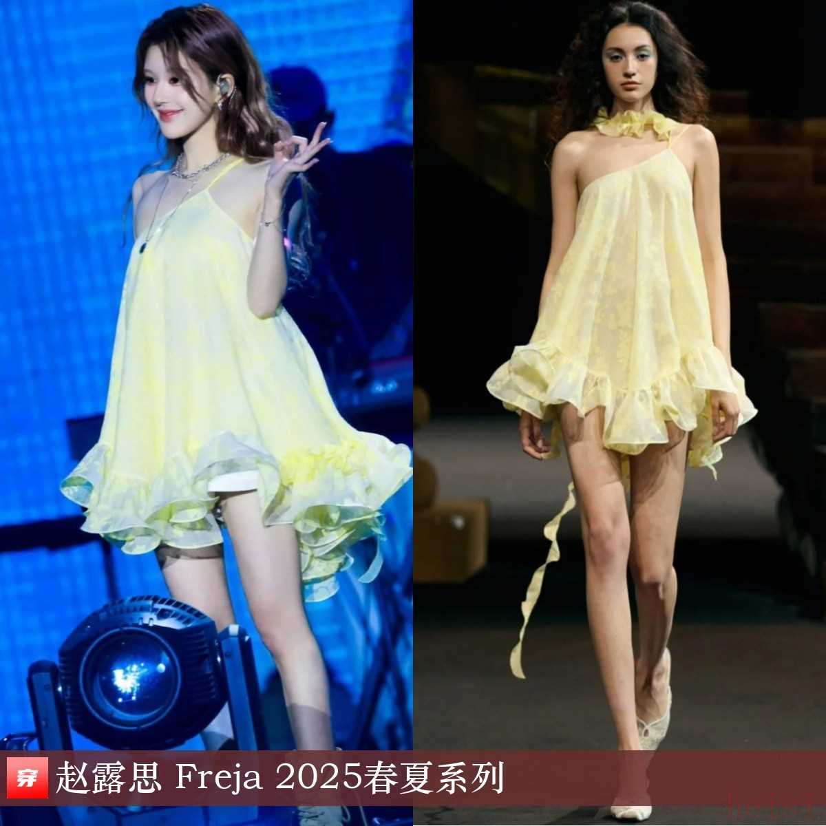 趙露思,2025葫蘆果音樂節(jié)滁州站。鵝黃色刺繡荷葉邊吊帶裙:Freja 2025春夏系列。裙子的顏色、設(shè)計都很適合舞臺。