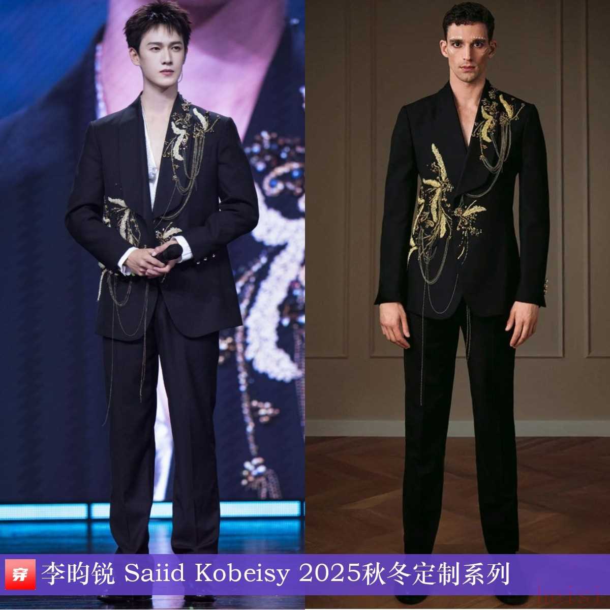 李昀銳,「Lin29號星球環(huán)游記」生日會。金色刺繡黑色西服套裝:Saiid Kobeisy 2025秋冬定制系列。深V,必須好評!