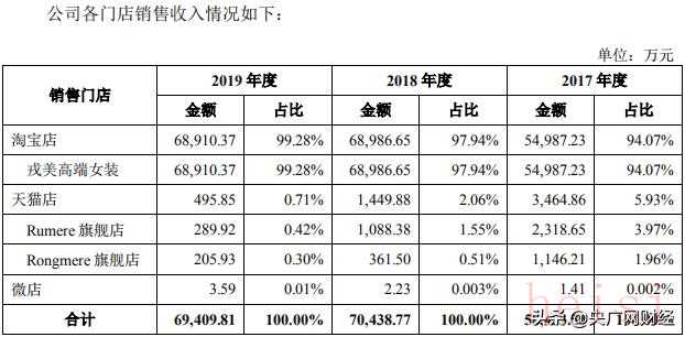具體而言,根據(jù)公布的數(shù)據(jù),2019年,淘寶店(戎美高端女裝)、天貓店(Rumere 旗艦店以及Rongmere 旗艦店)和微店分別實(shí)現(xiàn)銷售收入6.89億元、495.85萬(wàn)元和3.59萬(wàn)元,占比分別為99.28%、0.71%和0.01%。