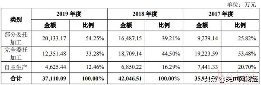 根據(jù)招股書(shū)介紹,戎美股份的供應(yīng)鏈主要分為三種模式:部分委托加工、完全委托加工和自主生產(chǎn)。戎美股份采取外協(xié)生產(chǎn)為主、自主生產(chǎn)為輔的生產(chǎn)模式。2019年部分委托加工、完全委托加工和自主生產(chǎn)的營(yíng)業(yè)成本分別為2.01億、1.23億和4625.44萬(wàn)元,占比分別為54.25%、33.28%和12.46%。