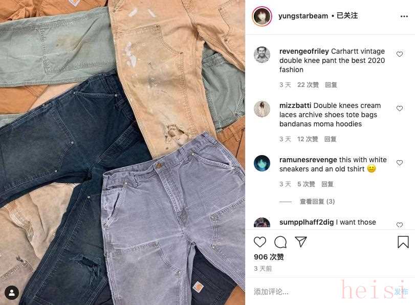 @revengeofriley 就認為,「Vintage Carhartt 工裝褲」是 2020 年最棒的潮流單品,二級市場價格也逐漸上漲,不少人認為,「始作俑者」也包括如 Gallery Dept. 等品牌;