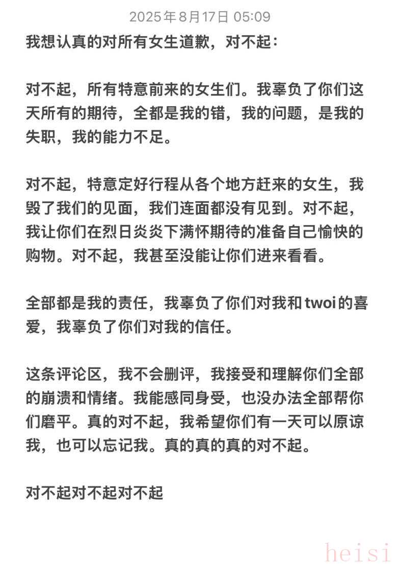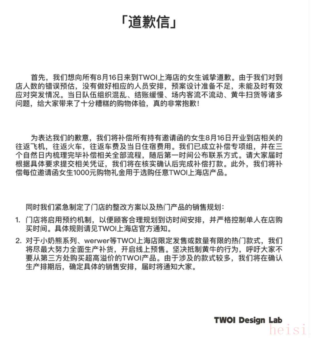 8月18日,品牌發(fā)布正式道歉信,并公布補(bǔ)償方案:補(bǔ)償所有持有函的女生8月16日開業(yè)到店相關(guān)的往返飛機(jī),往返火車,往返車費(fèi)及當(dāng)日住宿費(fèi)用,已成立補(bǔ)償專項(xiàng)組。此外,將補(bǔ)償每位函女生1000元購(gòu)物禮金用于選購(gòu)任意TWOI上海店產(chǎn)品。