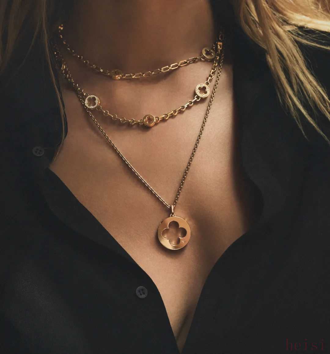 戒指與手鏈交疊的線條設計形似路易威登經典硬箱的皮革系帶,勾勒出心靈之間的緊密牽絆;鐫刻有 LV 字母標識的耳環(huán)與鑲鉆玫瑰金耳夾曲線分明,在耳間閃爍出迷人的光彩;經典四葉草猶如當代人的護身符,串聯起項鏈與手鏈,并滿足多種堆疊佩戴的配搭巧思——吊墜可配雙鏈,也能分別以單花的形式佩戴;長項鏈則可輕松轉變?yōu)槎鄬邮宙溁虔B戴項鏈。