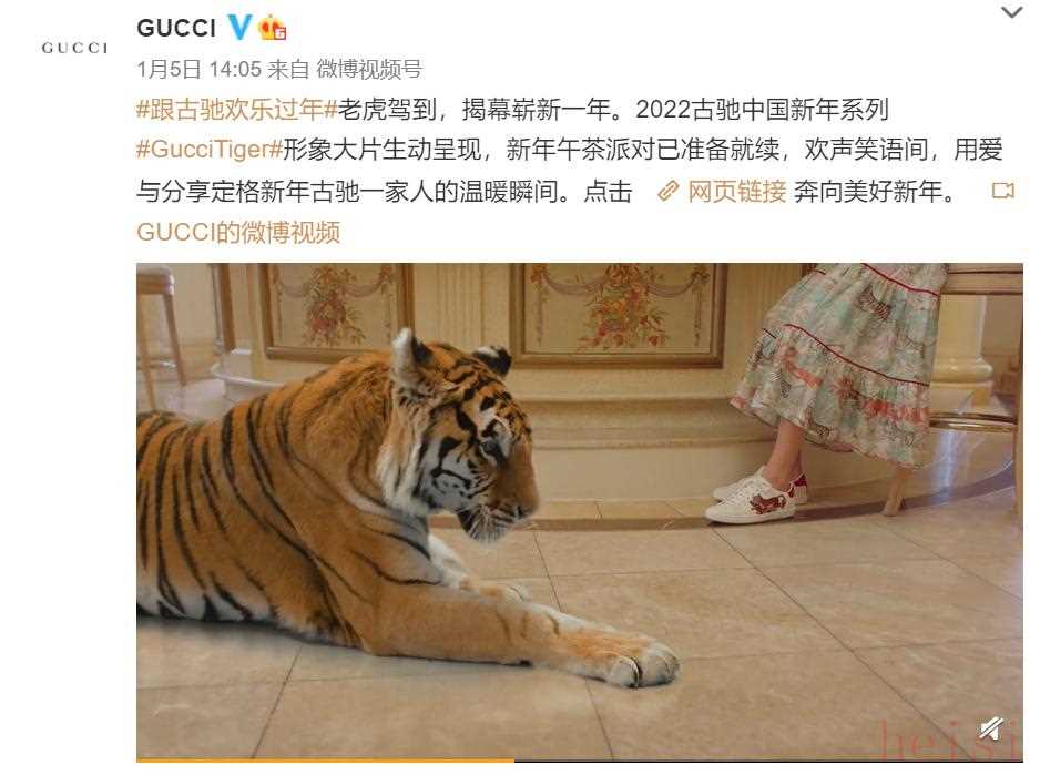GUCCI官方微博1月5日也發(fā)布了廣告視頻,配文提到“老虎駕到,揭幕嶄新一年。2022古馳中國新年系列”。視頻中也同樣出現(xiàn)老虎的身影。