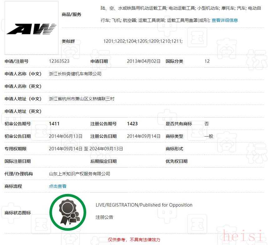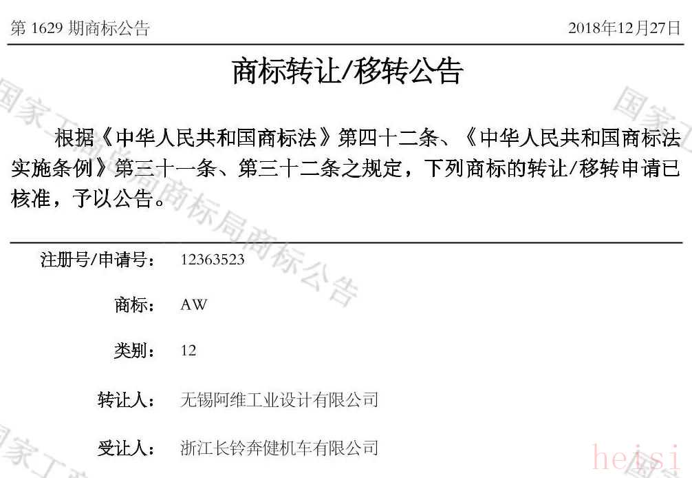 于是再去找這個品牌的信息發(fā)現(xiàn),AW原本屬于無錫阿維工業(yè)設(shè)計有限公司,據(jù)悉該公司早期確實是設(shè)計的地平線。而目前在國家知識產(chǎn)權(quán)局信息中顯示,AW商標(biāo)在2018年12月轉(zhuǎn)讓給了浙江長鈴奔健機(jī)車有限公司,也就是奔達(dá)。