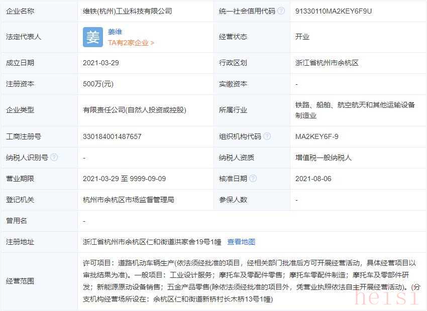 不過在今年,阿維工業(yè)法人在杭州成立了維鐵(杭州)工業(yè)科技有限公司,經(jīng)營范圍包括了道路機(jī)動車輛生產(chǎn)、摩托車及零部件研發(fā)制造銷售,而地址就和奔達(dá)現(xiàn)在的工廠很近。