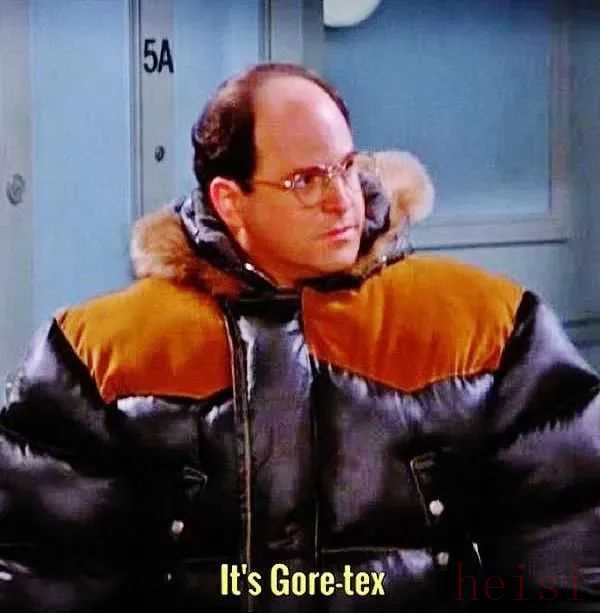 在美國家喻戶曉情景喜劇《Seinfeld》中,演員穿著造型夸張的羽絨服登場,一句“It's GORE-TEX”,就讓這部劇的熱度上升了一倍。