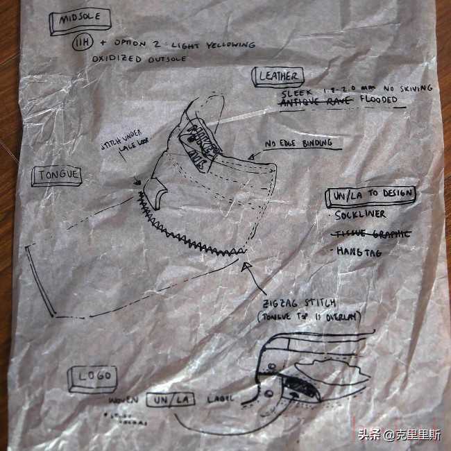 鞋幫處的印有Union LA 的縮寫 (UN / LA) 標(biāo)簽,內(nèi)部鞋墊處、鞋盒以及包紙更是采用特殊設(shè)計(jì),以此彰顯聯(lián)名身份。其中包紙的設(shè)計(jì)還是比較打動(dòng)人的,類似于手稿圖紙將其印在包裝紙上,新奇滿滿。