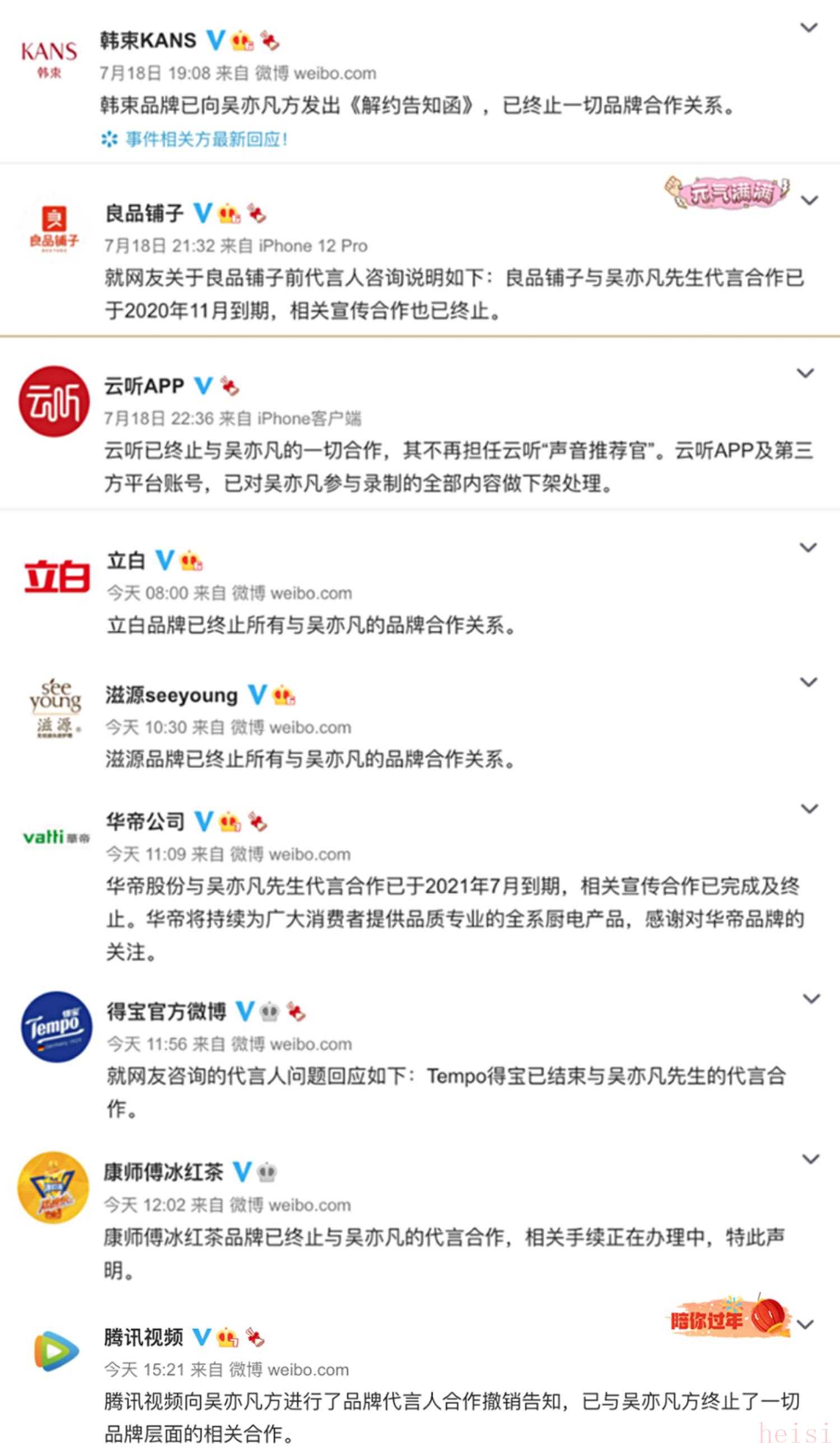 一夜之間,韓束、云聽APP、立白、滋源、康師傅冰紅茶、騰訊視頻等約10家品牌宣布與吳亦凡終止合作,相關(guān)宣傳內(nèi)容也被刪除。同時(shí),還有品牌刪除與吳亦凡相關(guān)的宣傳信息。