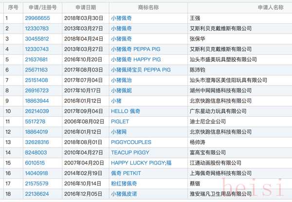 在商標(biāo)局搜索“小豬佩奇”,可以看到商標(biāo)申請(qǐng)者諸多