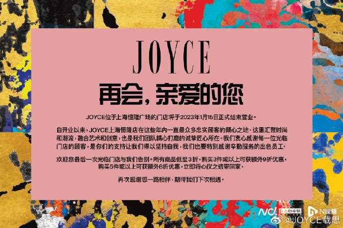 2.  "最新動態(tài)":Joyce宣布將關(guān)閉其位於廣州天環(huán)廣場的旗艦店,結(jié)束了該店約6年的運營歷史。