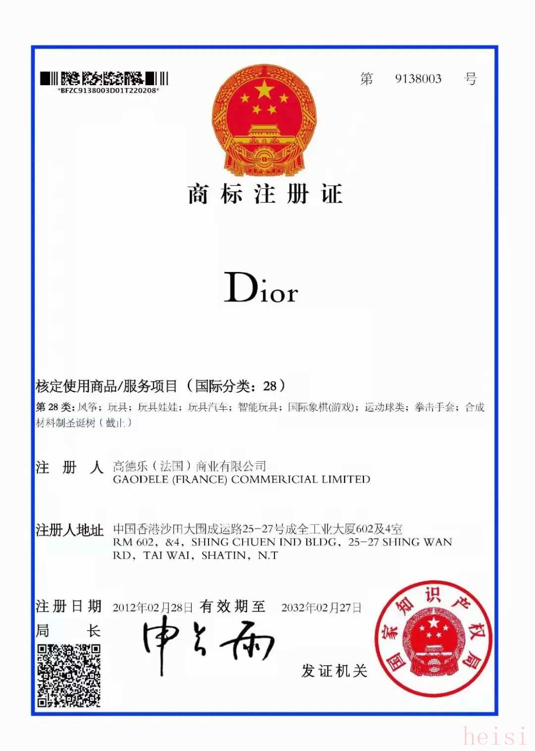 中國(guó)商標(biāo)網(wǎng)信息顯示,申請(qǐng)人高德樂(lè)(法國(guó))商業(yè)有限公司注冊(cè)的“Dior”商標(biāo)涉及玩具、運(yùn)動(dòng)球類等領(lǐng)域,專用權(quán)期限為2022年2月28日至2032年2月27日。