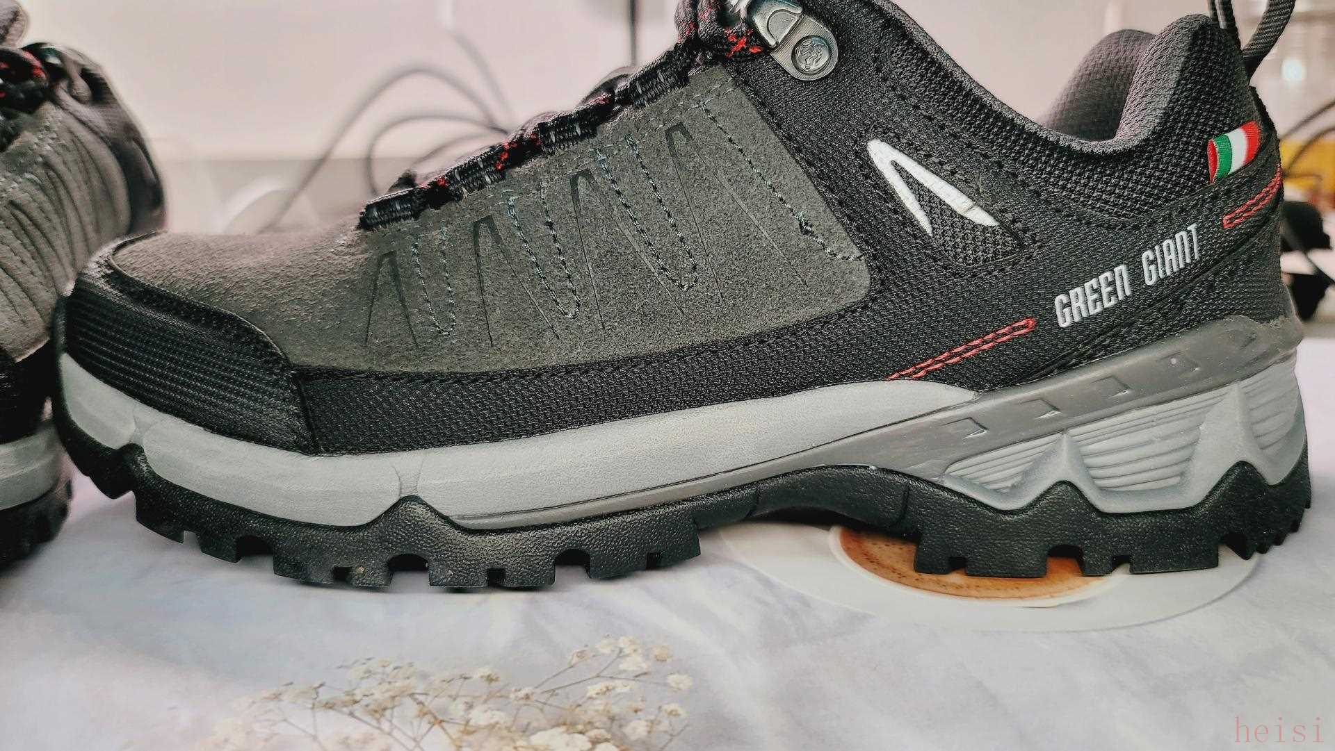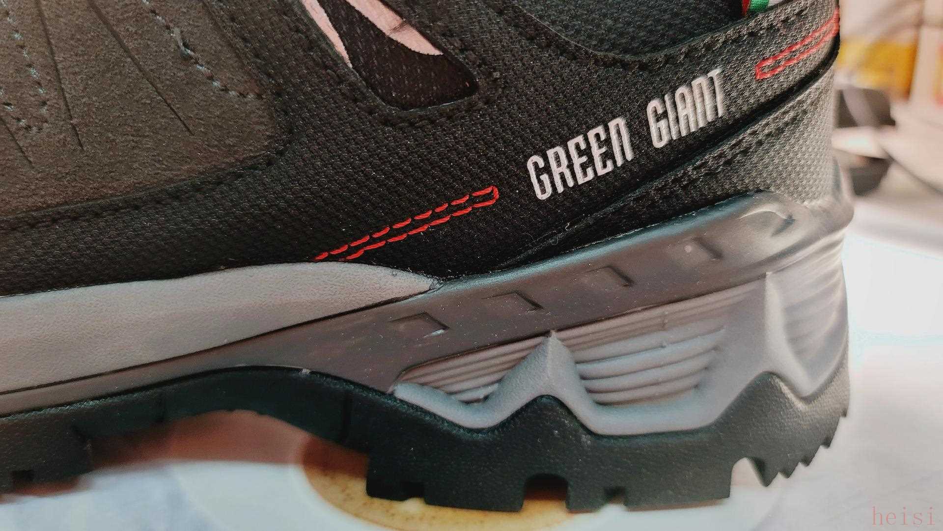 "鞋面:" 大部分綠巨人系列會采用人造麂皮(PU麂皮)或高密度編織網(wǎng)布拼接,部分高端型號可能使用部分真皮。人造麂皮提供了較好的手感和透氣性,但耐用性略遜于真皮;編織網(wǎng)布則輕量、透氣,且防水性能通常需要額外處理或依賴涂層。鞋面設(shè)計注重包裹性和支撐性,鞋頭通常有加厚